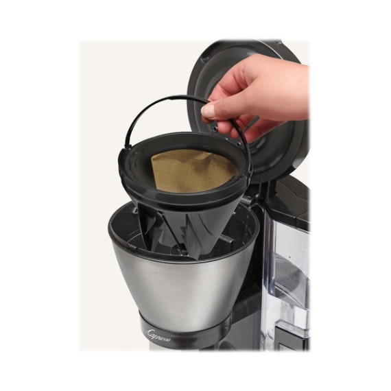 Wake up and smell the coffee with this programmable Capresso rapid-brew coffee maker. It makes up to 10 cups in less than 7 minutes, and its permanent gold-tone filter eliminates the cost of paper ones. The thermal stainless steel carafe of this Capresso rapid-brew coffee maker keeps your beverage hot, and the unit automatically turns off for safety.