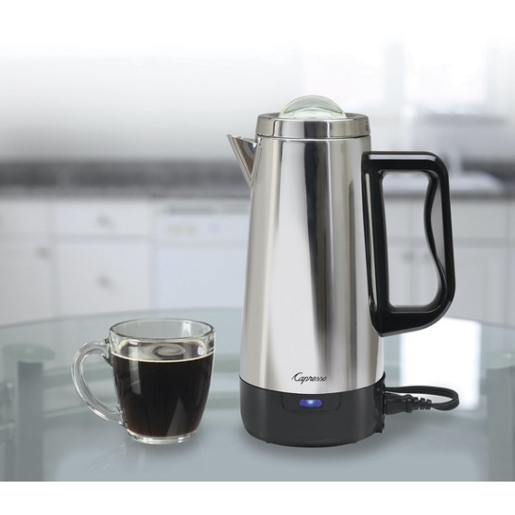 Start your morning right with a cup of joe from this Capresso percolator. The drip-free spout ensures precise pouring, and the heat-resistant base is safe to set on the table or counter. This Capresso percolator brews up to 12 cups at a rate of less than 1 minute per cup to get you out the door faster.