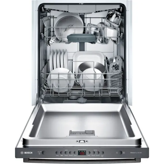 Keep the noise level down with the legendary quiet operation of this Bosch dishwasher. The InfoLight lets you know when it's running, and the hidden controls on the smudge-resistant stainless steel front panel contribute to your modern kitchen's refined look. The third rack in this Bosch dishwasher provides 30 percent more loading area.