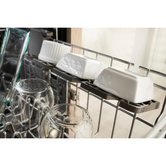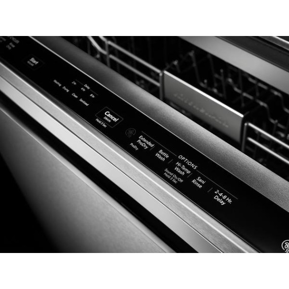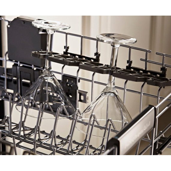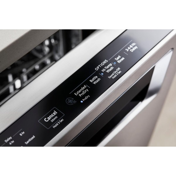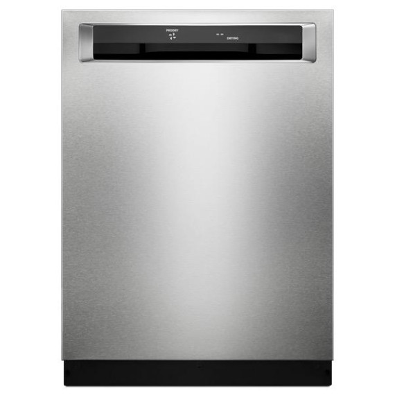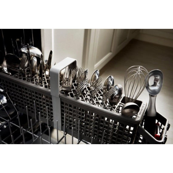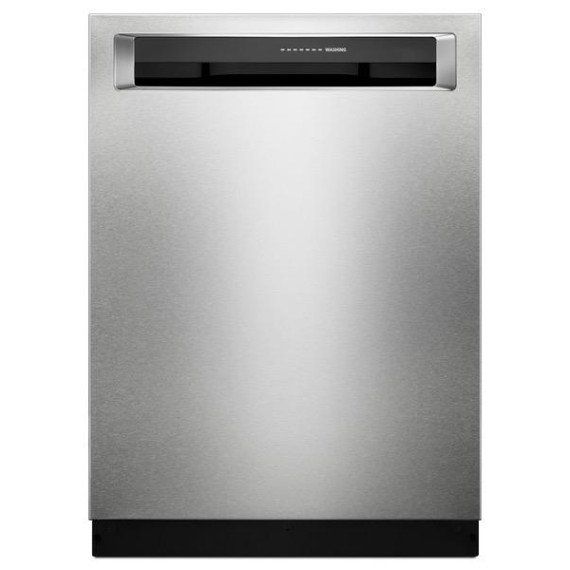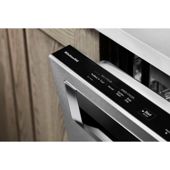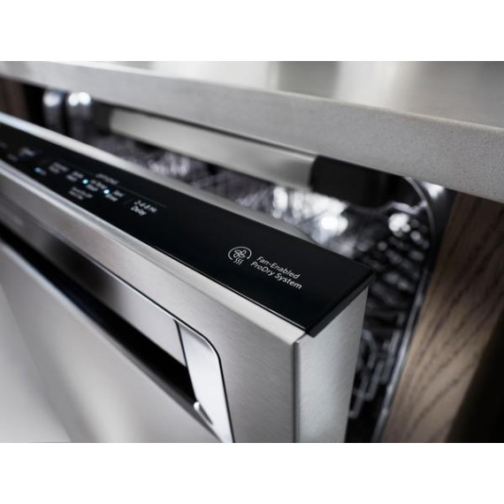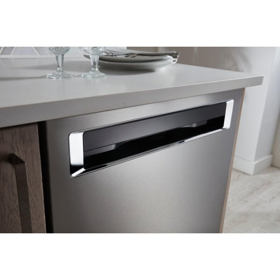 Enjoy the modern styling of the oversize pocket handle on this KitchenAid dishwasher. A third-level rack accommodates items that are typically hard to place, and the PrintShield finish protects against fingerprints and smudges. This KitchenAid dishwasher uses a fan-enabled ProDry system to quickly wick away moisture.