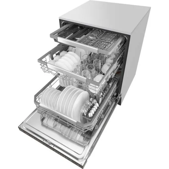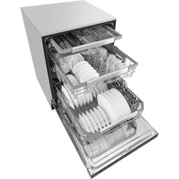 Achieve a new level of cleaning with this LG dishwasher. Its QuadWash technology has multi-motion arms that spray water from multiple angles to clean every part of your dishes, and its glide rails make it easy to reach items in the back. This LG dishwasher has a third rack with three height positions to accommodate tall glasses.