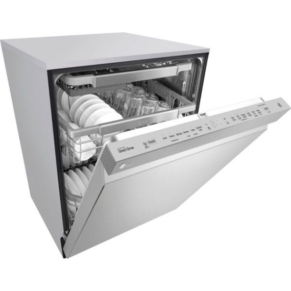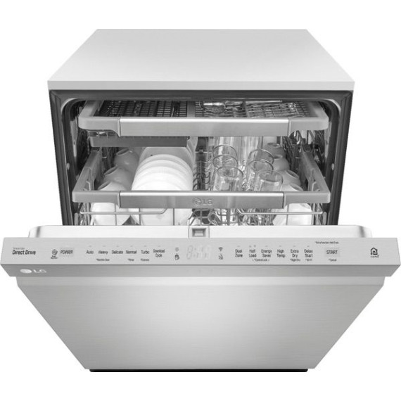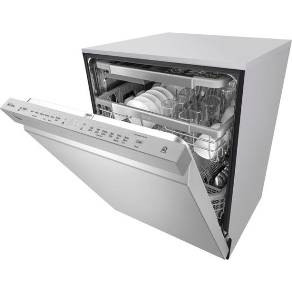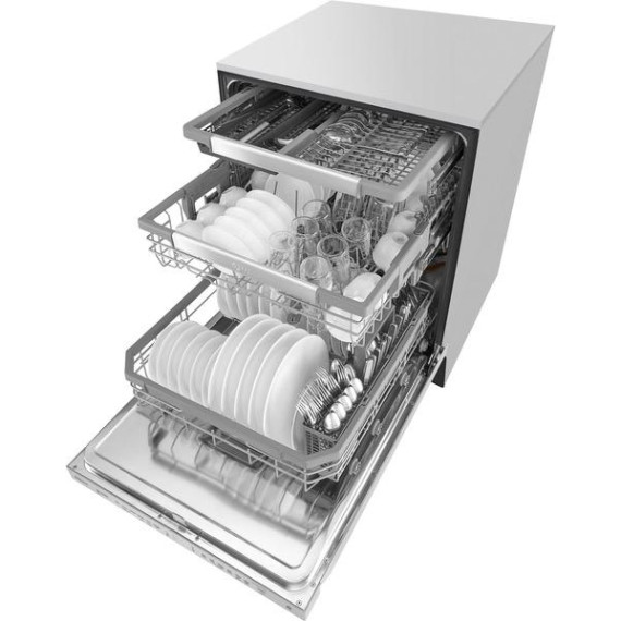 Enjoy an appliance that's both flexible and powerful with this LG dishwasher. Its three racks pull out smoothly for easy access to items at the back, and its top rack has three height settings to accommodate tall items. High-pressure jets on this LG dishwasher provide deep cleaning, and the QuadWash technology has rotating arms that spray at multiple angles.