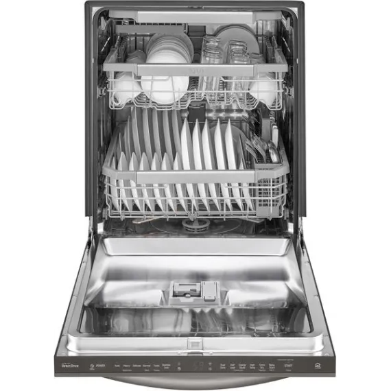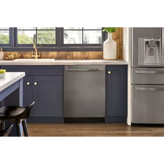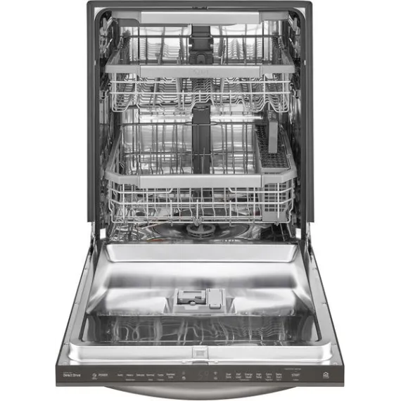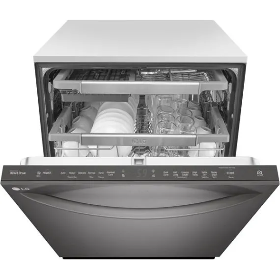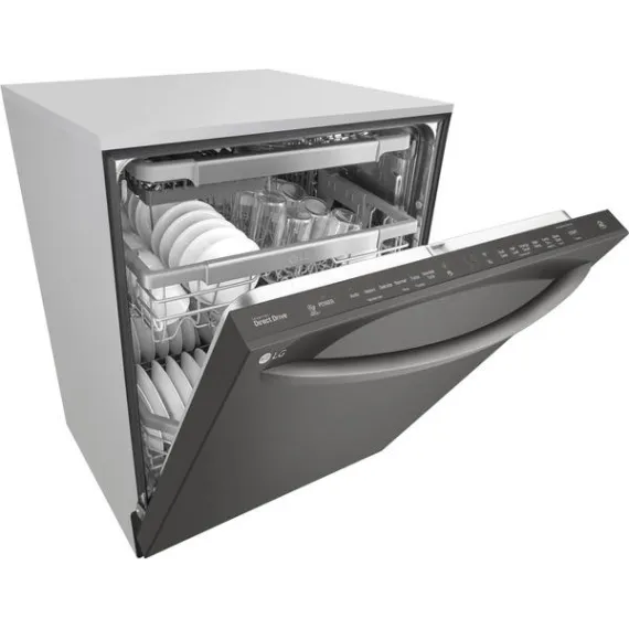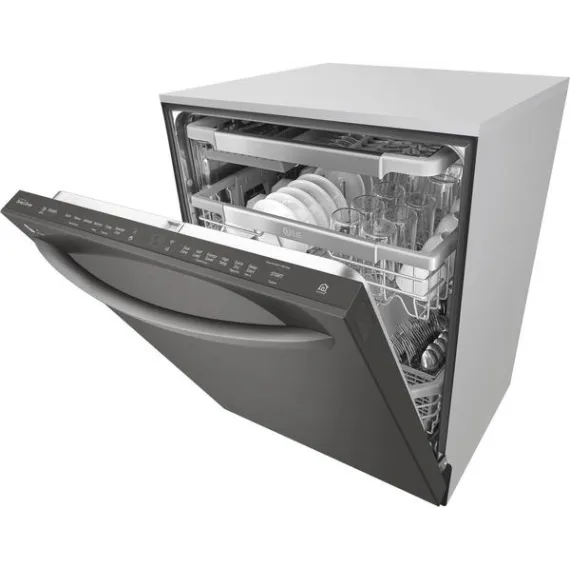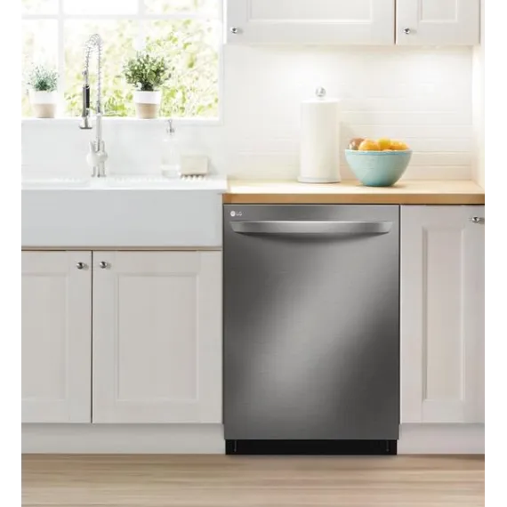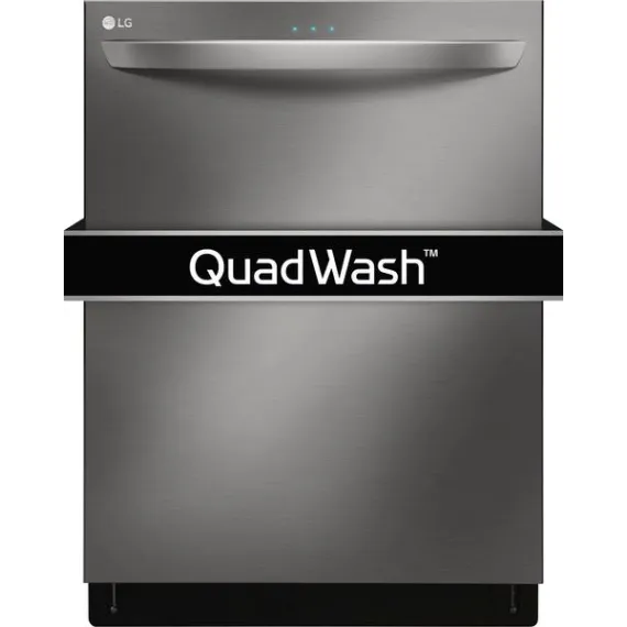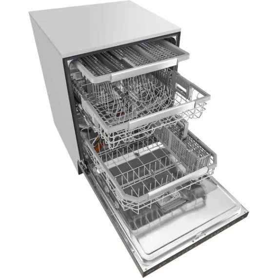 Handle large loads with this LG dishwasher. Its three racks pull out smoothly thanks to the glide rail technology, and the top rack has three height settings to accommodate taller items if needed. This LG dishwasher uses a four-armed QuadWash sprayer that moves to clean from multiple angles for thorough washing.