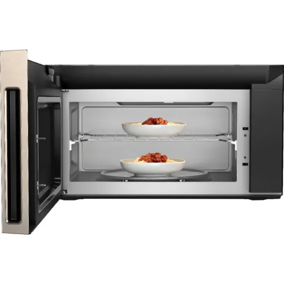 Upgrade your cooking experience with this 1.9 cu. ft. Whirlpool microwave. This unit installs over the range to save countertop space, and its True Convection technology ensures food is heated evenly. This 1600W Whirlpool microwave has a four-speed, 400-cfm fan system to provide ventilation and keep cooking odors out of the kitchen.