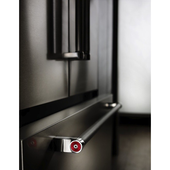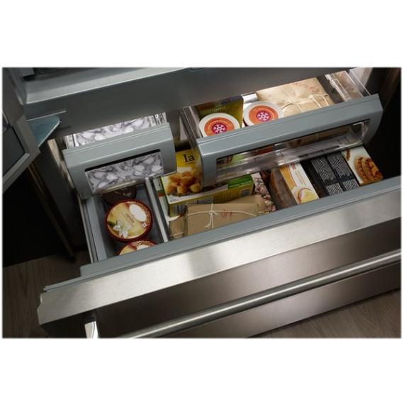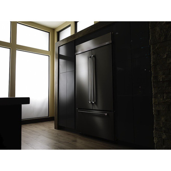 Upgrade your kitchen with this built-in KitchenAid French door refrigerator. It has an independent cooling system that preserves fresh food longer and a separate system that handles frozen foods. The integrated automatic ice maker ensures you always have ice on hand, and the FreshFlow air filter minimizes odors in this 24.2 cu. ft. KitchenAid French door refrigerator.