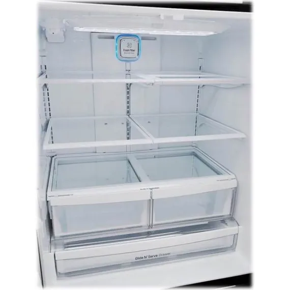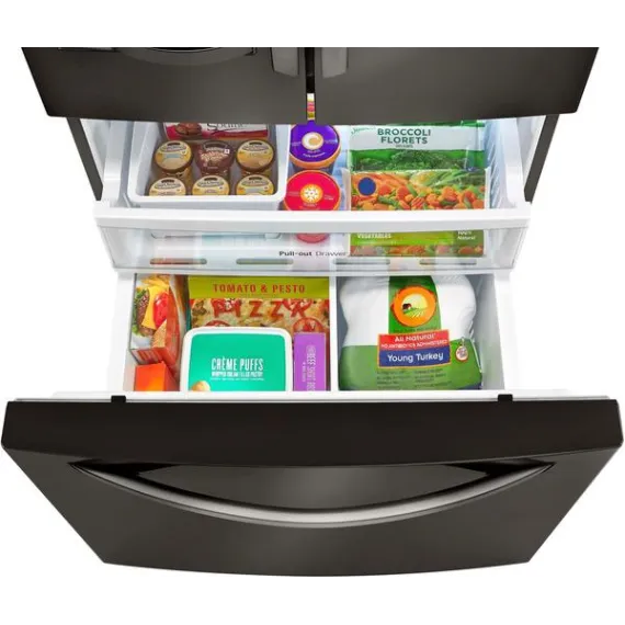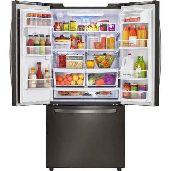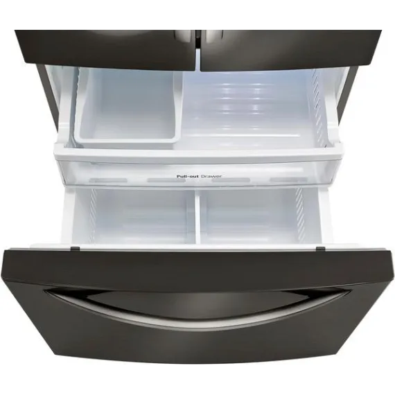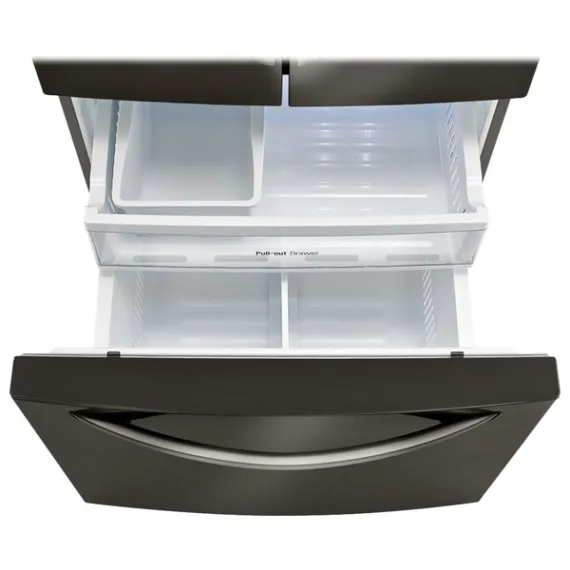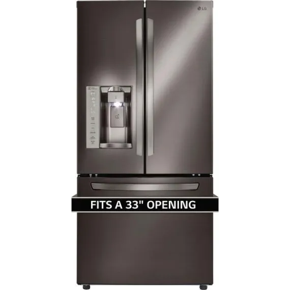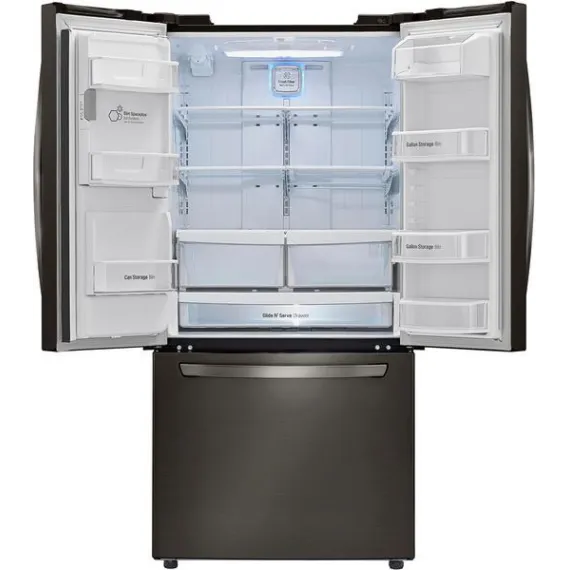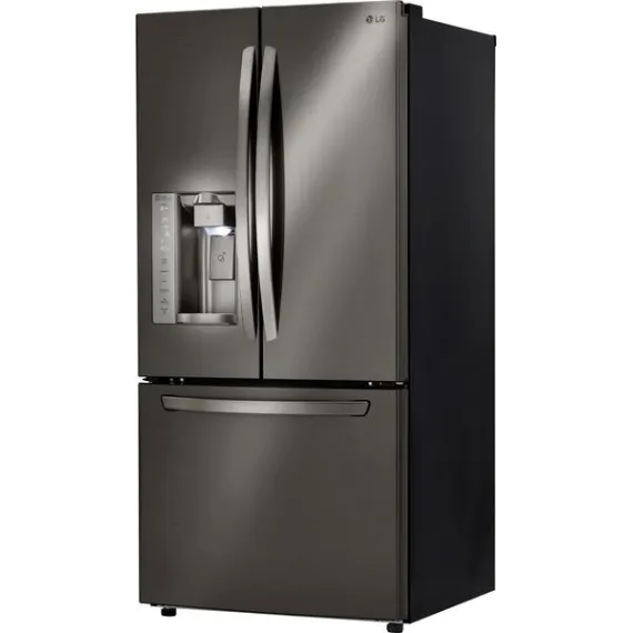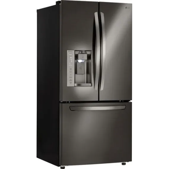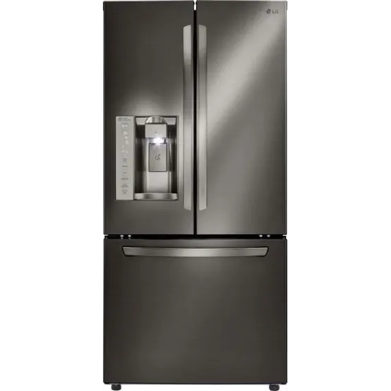 Add a modern edge to your kitchen décor with this LG three-door refrigerator in a bold black stainless steel. French-style doors offer easy access to produce and perishables, while the bottom freezer drawer provides ample space for frozen meats and meals. The Slim SpacePlus icemaker on this LG three-door refrigerator makes a lot of ice without taking up usable space.