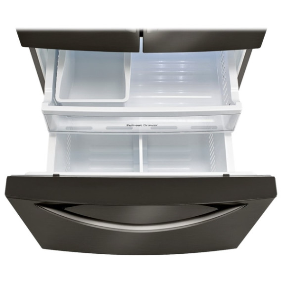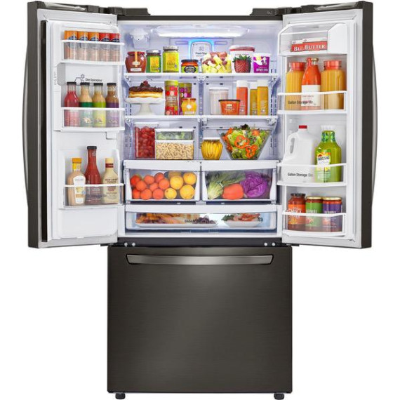 Add a modern edge to your kitchen décor with this LG three-door refrigerator in a bold black stainless steel. French-style doors offer easy access to produce and perishables, while the bottom freezer drawer provides ample space for frozen meats and meals. The Slim SpacePlus icemaker on this LG three-door refrigerator makes a lot of ice without taking up usable space.
