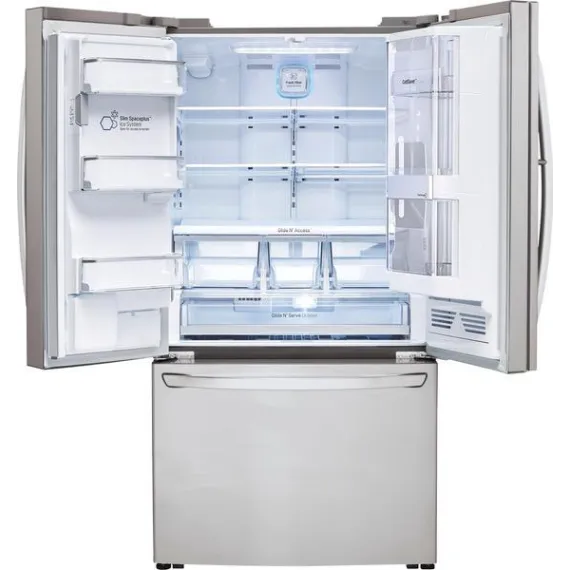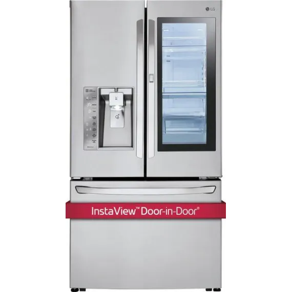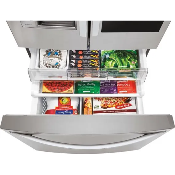 Check out snack choices without letting out the cold air with this three-door LG refrigerator. Its illuminated window lets you see what's inside before you open it, and its external dispenser provides ice and water with a touch. This 30 cu. ft. LG refrigerator has a three-level pull-drawer freezer for easy organization.