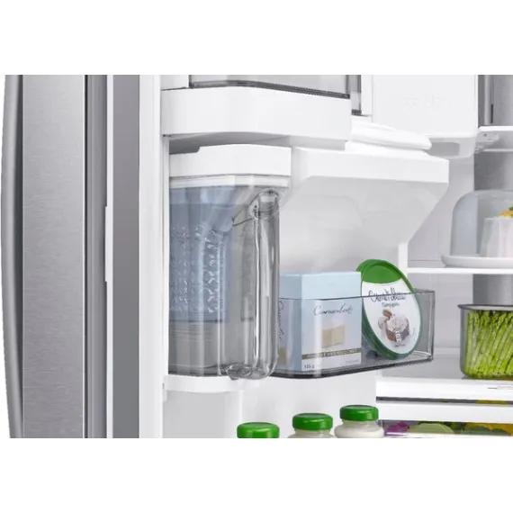 A refrigerator that is beautifully designed, with an modern dispenser, polished door, and sleek handles. The Food Showcase Door provides quick access to on-the-go items.