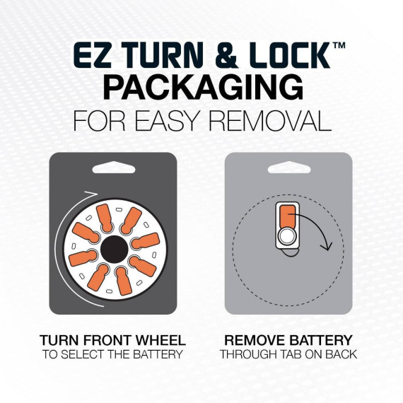 You’ll love hearing this: Energizer has its longest-lasting size 13 hearing aid batteries ever. And trust us, we know a thing or two about ears. These orange tab size 13 batteries deliver consistent sound quality across their life span for a better hearing experience. They’re also designed to prevent damaging leaks and premature low battery signals. The premium perforated packaging is more discrete and portable than our previous design. Just spin the double-sided battery dial to access the battery, install in your device with our long tabs, and easily lock the battery door to keep remaining batteries safely inside. Get our best performance and enjoy hearing everything the world has to offer with Energizer hearing aid batteries size 13.
