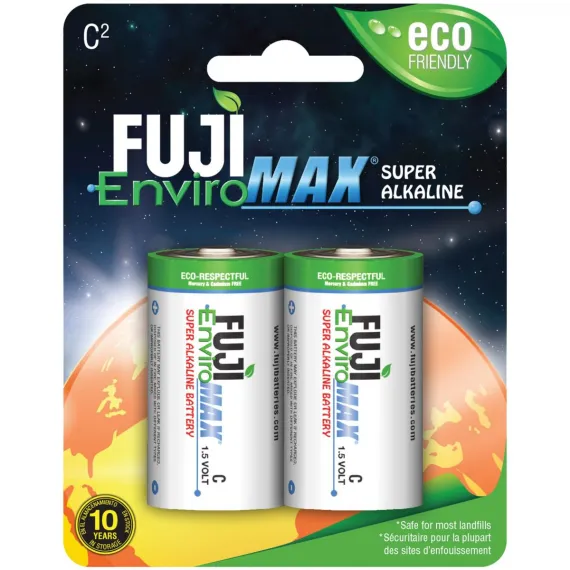 From Fuji comes environmentally respectful yet powerful batteries—the EnviroMax Super Alkaline Batteries! This 2 pack of C batteries is ideal for toys, smoke detectors, radios, clocks and more. Fuji EnviroMAX batteries are not only cadmium-, mercury- and PVC-free, they are made in some of the world’s most environmentally friendly battery plants that operate under some of the most strict standards of environmental responsibility. In fact, most of all resources used in the Fuji EnviroMAX manufacturing process are reused and recycled! Even the Fuji EnviroMAX batteries themselves are labeled and packaged with eco-friendly, 75% recycled materials and PET plastic! Plus, independent tests show Fuji EnviroMAX batteries equal—and most often exceed—the performance and longevity of equivalent major brands.
