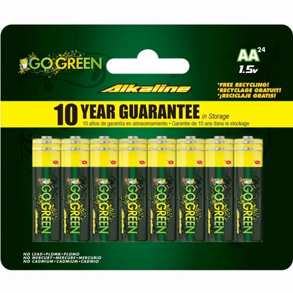 GoGreen Power Alkaline AA batteries are an ideal choice for all your high-draining devices. This pack of 24 AA batteries are the perfect choice for eco-conscious customers. We need batteries to power critical devices in our lives, but disposing of them in a landfill is bad for the environment. As they break down, they can leak chemicals into groundwater and release known carcinogens. Our alkaline batteries contain no lead, cadmium, or mercury. These AA batteries have a lifespan and performance comparable to the top brands on the market but with a green mindset. Due to the lack of these chemicals, even if the batteries do end up in landfills, they will not leak harmful chemicals into the groundwater or land. These alkaline batteries are made of manganese dioxide, & contain no cadmium or lead. It is suggested to use alkaline batteries for your high drain power devices, such as flashlights, television remotes, toys and much more! By purchasing this pack of 24 alkaline batteries, you not only will get a high-quality product; but also get ecological peace of mind with hassle-free recycling. We offer free recycling and free shipping back of the used product to our recycling facility. Please view the recycling code and instructions on the back of the package and visit the GoGreen Power website for additional information.