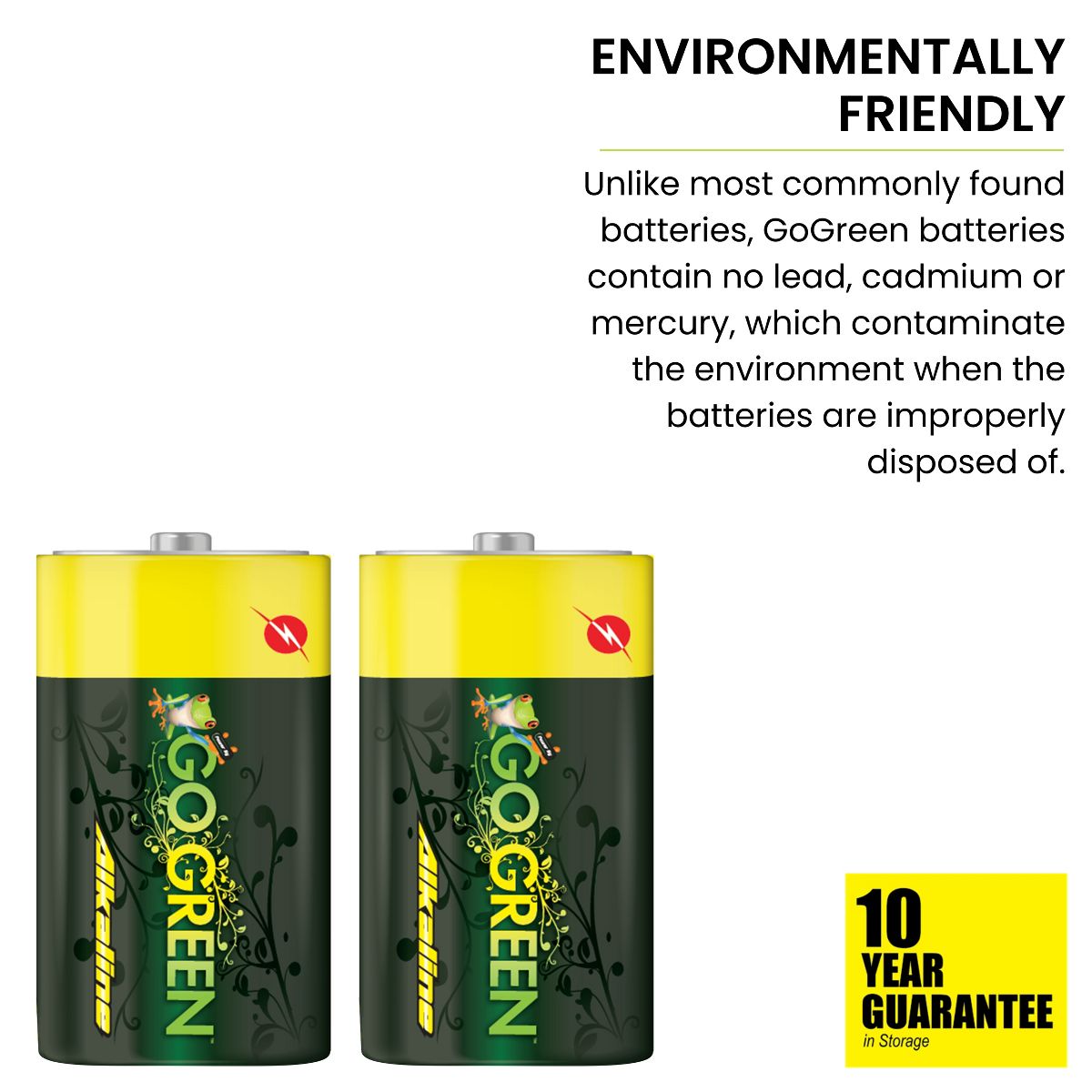 GoGreen Power Alkaline AA batteries are an ideal choice for all your high-draining devices. This pack of 24 D batteries are the perfect choice for eco-conscious customers. We need batteries to power critical devices in our lives, but disposing of them in a landfill is bad for the environment. As they break down, they can leak chemicals into groundwater and release known carcinogens. Our alkaline batteries contain no lead, cadmium, or mercury. These D batteries have a lifespan and performance comparable to the top brands on the market but with a green mindset. Due to the lack of these chemicals, even if the batteries do end up in landfills, they will not leak harmful chemicals into the groundwater or land. These alkaline batteries are made of manganese dioxide, & contain no cadmium or lead. It is suggested to use alkaline batteries for your high drain power devices, such as flashlights, television remotes, toys and much more! By purchasing this pack of 24 alkaline batteries, you not only will get a high-quality product; but also get ecological peace of mind with hassle-free recycling. We offer free recycling and free shipping back of the used product to our recycling facility. Please view the recycling code and instructions on the back of the package and visit the GoGreen Power website for additional information.