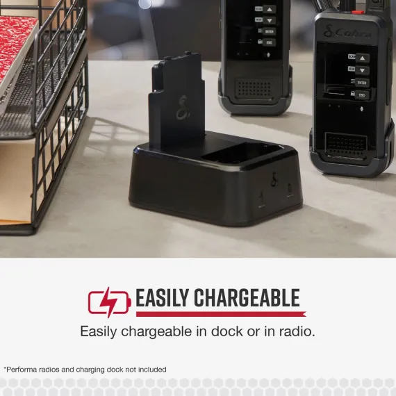 Is your company using Cobra® Performa 2-way handheld business radios? Use this Cobra® Li-Ion Battery as either a replacement or a backup rechargeable battery for your Performa 400 or Performa 450 handheld 2-way radio. It easily charges in either a Performa charging dock or a Performa radio. It is a durable, low-profile, high-capacity battery suitable for any work environment.