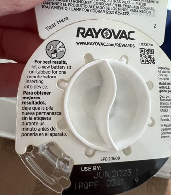 Rayovac's most advanced hearing aid battery yet*. No hearing aid battery lasts longer**-plain and simple, or your money back†! Our cells are engineered with an advanced formula†† that performs in the most power-hungry hearing devices. This long-lasting formula provides consistent, high-quality performance throughout the life of the battery. Our innovative package features longer battery tabs††, a secure dial and an easy access reclosable door. *excludes size 675 **Based on ANSI/IEC Performance Tests for size 10. †Money Back Guarantee: Contact 1-800-891-6091 visit rayovac website for more details. Restrictions apply. †† vs. previous RAYOVAC design (excludes size 675) + Reported by size 312 users in 2017 field study (varied by device and use, excludes size 675) ++ Proudly made in Portage, WI, with US and global parts.