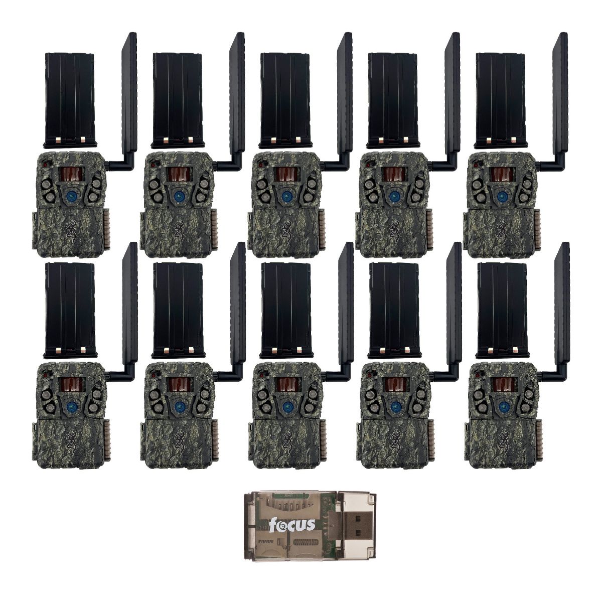 Browning Trail Camera Defender Wireless Vision Pro HD AI 46MP (10 Pack)Unleash the power of intelligent wildlife scouting with the Defender Vision Pro HD AI by Browning Trail Cameras. This game-changing camera combines advanced AI technology with unparalleled imaging capabilities, putting you in control of what you see and when you see it. No more sifting through endless photos of non-target animals – this smart AI camera filters out irrelevant images, focusing on the shots you want. Through the Strike Force Wireless app, instantly access only the images that matter, streamlining your scouting and maximizing your time in the field.Crystal-Clear Imaging & On-Demand AccessEvery detail of the wild is at your fingertips with 46MP images and 1080p HD video recording. The Defender Vision Pro HD AI’s high-speed image uploads mean you’re always just a click away from real-time, all-HD visuals of your target environment. From sunrise to starlit nights, capture high-definition scenes with brilliant clarity, thanks to the ultra-responsive high-gain cellular antenna, ensuring rapid uploads from anywhere in the field.Unbeatable Speed, Night Vision, and Field ManagementWith a lightning-fast 0.135-second trigger speed, 0.5-second recovery time, and a remarkable 110-foot infrared illumination range, this camera guarantees you capture every critical moment – day or night. Browning’s Illuma-Smart Technology intelligently adjusts the IR flash for pristine night images, with adjustable flash modes (Power Save, Fast Motion, Long Range) to suit any environment. Built-in GPS tagging enhances security and lets you locate your camera at a moment’s notice, ensuring worry-free scouting.Control at Your FingertipsThe Defender Vision Pro HD AI offers unmatched convenience with the Strike Force Wireless app. Organize and map GPS-tagged images, manage folders effortlessly, and enjoy on-demand updates with scheduled or instant uploads. Activate the camera only when you need it with month-to-month data plans – no commitments required. Stay informed on the go with real-time notifications via email or text, giving you complete control and peace of mind.Built to Keep Up with YouWith extended battery life on just 8 AA batteries and support for an external 12-volt power source, this camera is ready for the long haul. Store up to 512GB of data with an SDXC card, so you never miss a single frame, and capture every second with Smart IR Video and multi-shot options.Browning Trail Cameras Rechargeable Lithium-Ion Battery Pack for Trail Cameras with Longer Life SpanExtend your camera's battery life by 30 percent with the Browning Trail Cameras Rechargeable Lithium-Ion Battery Pack, an eco-conscious solution designed for long-lasting performance. Swap out these lithium packs in the field for continuous, dependable power, eliminating the need for disposable batteries and ensuring you capture every moment. Recharging is straightforward with the included USB-C power cord, providing convenience and readiness in any setting. Compatible with a range of Browning models, including BTC-VPHD, BTC-VPHD-AI, BTC-VPHD-L, BTC-7E-HP5, and BTC-8E-HP5. Experience seamless power and make the most of your trail camera’s capabilities with this high-efficiency battery pack.All-In-One High Speed Card ReaderTransfer data to and from your PC with this All-In-One High-Speed USB 2.0 Card Reader. The high-speed memory card reader provides a transfer rate of 480 Mbps and supports most media cards, including SD, SDHC, micro SD, MMC, TF, M2, and PRO Duo cards. Compatible with both Mac and PC systems, this USB card reader is made with a plastic shell that is exceptionally durable..