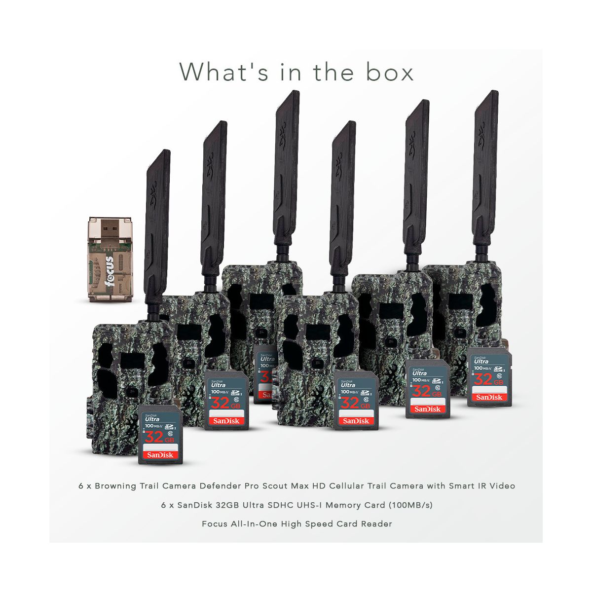 Browning Trail Camera Defender Pro Scout Max HD Cellular Trail Camera with Smart IR VideoSanDisk 32GB Ultra SDHC UHS-I Memory Card (100MB/s)The SanDisk 32GB Ultra SDHC UHS-I Memory Card allows you to capture better pictures and Full HD videos with your compact to mid-range point and shoot cameras. Store tons of photos and videos, with speeds up to 100MB/s to quickly transfer it all to your computer.Capture the MomentThis SanDisk Ultra SD card delivers exceptional photo and video shooting performance to let you capture your memories when they happen.Picture and VideoCapture amazing quality pictures and Full HD video with your compact point-and-shoot camera.Keep ShootingShoot tons of photos and hours of Full HD video (1080p) without changing the card.DurableThis SanDisk Ultra SD card is durable and tested to protect your memories from life’s mishaps—waterproof, shockproof, x-ray proof, and temperature-proof.Focus All-In-One High Speed Card ReaderTransfer data to and from your PC with this All-In-One High-Speed USB 2.0 Card Reader by Focus Camera. The high-speed memory card reader provides a transfer rate of 480 Mbps and supports most media cards, including SD, SDHC, micro SD, MMC, TF, M2, and PRO Duo cards. Compatible with both Mac and PC systems, this USB card reader is made with a plastic shell that is exceptionally durable..