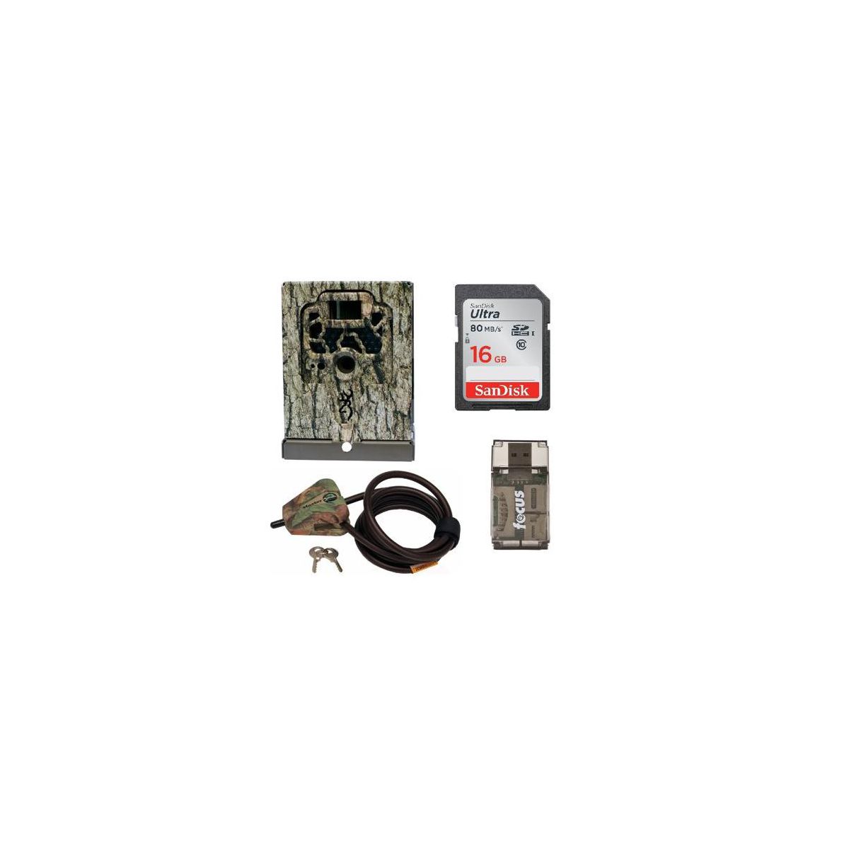 Browning Trail Camera Security BoxBrowning is committed to designing and manufacturing the most covert, innovative, and powerful game cameras on the market. The Browning Trail Camera Security Box is a robust camera security box specifically designed for Browning's line of wildlife cameras. Constructed out of 16 gauge steel, the security box was built to withstand anything that nature can throw at it. The security box prevents against, weather damage, animal interference, theft, and will have your game camera staying exactly where you left it. The Browning Trail Camera Security Box can be locked with a standard padlock or a Master Lock Python cable for maximum protection.Built to LastBrowning is made up of a group of avid hunters and outdoor lovers who understand what it takes to truly conquer the outdoors. Browning’s trail camera security boxes keep your game camera exactly where you left it as the 16 gauge steel box protects your game camera against all kinds of dangers. Protect your investment and protect your wildlife camera with Browning’s Trail Camera Security Box.Master Lock Python Adjustable Locking CableThe Master Lock 8418KADCAM-TMB Python Adjustable Locking Cable is a 6ft (1.8m) long durable cable lock made with braided steel for maximum strength and flexibility. The protective coating of the Master Lock Python Adjustable Locking Cable protects against scratches, is extremely cut-resistant, and versatile for a range of stands and tree diameter sizes. This adjustable cable lock is equipped with a pick-resistant, reliable pin tumbler locking mechanism and a hook-and-loop closing strap which, holds excess cable in place. Along with the scratch resistant camo finish, this adjustable locking cable is sure to last the throughout the wilderness.SanDisk Ultra 16GB Class 10 SD Memory CardThe SanDisk Ultra 16GB Class 10 SD Memory Card is twice as fast as ordinary SDHC and cards, allowing it to take better pictures and Full HD videos. Its faster write speeds and Class 10 video recording performance make it a great choice for compact to mid-range point-and-shoot cameras and camcorders to capture top quality Full HD 1080p video and amazing pictures.Great for Capturing Full HD VideosSanDisk Ultra SDHC UHS-I Memory Card have a Class 10 speed ratings for recording Full HD (1080p) videos. Enjoy smooth video recording performance whether you're recording a family get-together, sporting event, or school play.Durable DesignSanDisk Ultra SDHC UHS-I Memory Card is shockproof, temperature-proof, waterproof, X-ray-proof, so you can enjoy your adventures without worrying about the durability of your memory card..