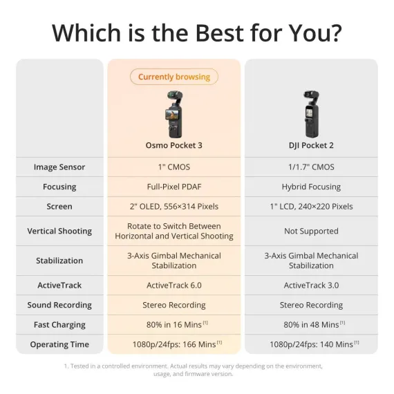 The all-new Pocket 3 features a powerful 1-inch CMOS sensor that puts detail-rich imaging right in the palm of your hand. With a 2-inch rotatable touchscreen and full-pixel fast focusing, go horizontal or vertical for more precise awareness and control. 4K/120fps, three-axis mechanical stabilization, and a host of intelligent features make Pocket 3 ready for any moving moment.