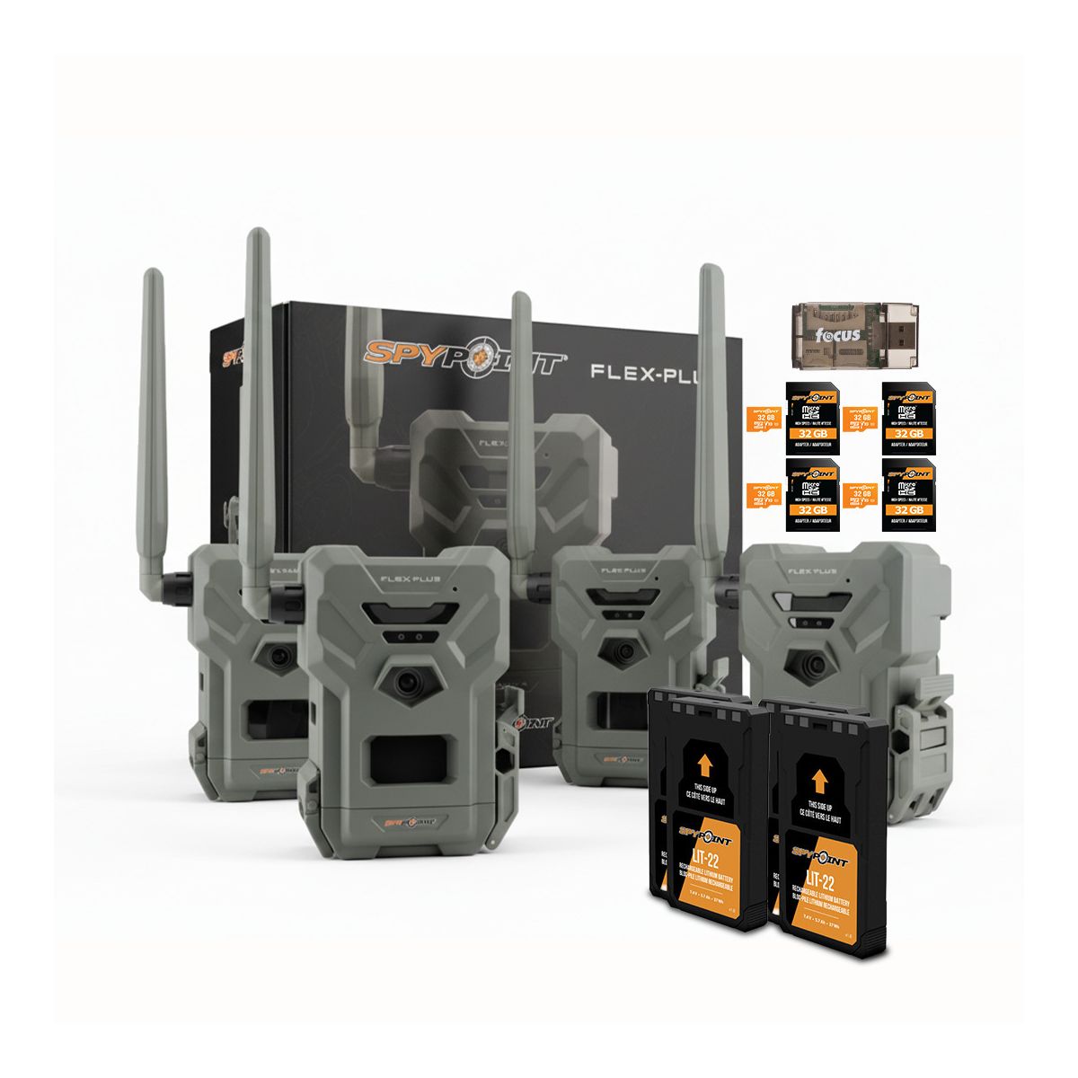 Spypoint Flex-Plus Cellular Trail Camera 36MP Photos 1080p Videos Dual-SIM LTE GPS Extended BatteryThe SPYPOINT Flex-Plus Cellular Trail Camera is designed for hunters and outdoor enthusiasts who demand performance and reliability. Capture stunning 36MP photos and crisp 1080p videos with sound, day or night, using its responsive trigger and 100' flash and detection range. With double the battery capacity, this camera delivers extended monitoring without frequent battery changes. Stay connected effortlessly with Dual-SIM LTE technology, ensuring cross-carrier coverage and uninterrupted photo and video transmission. Instant Mode lets you request high-definition images and videos on demand via the SPYPOINT app, while additional capture modes, Photo, Video, Time-Lapse, and Time-Lapse+ give you full control over monitoring. Take advantage of SPYPOINT’s free photo transmission plan, sending up to 100 photos per month with no fees or commitments, or upgrade to flexible paid plans for more. Complete with GPS functionality and an included installation strap, the Flex-Plus makes capturing and monitoring wildlife simple, reliable, and convenient.Spypoint MicroSD 32GB Ultra High Speed Class 10 Memory CardEnsure proper storage capacity and image retention with the Spypoint 32 GB ultra high-speed microSD card. The Spypoint MICRO-SD-32GB Class 10 Memory Card delivers the performance you need to capture the best images possible, and with 32 GB of storage, you won’t have to run to the woods to swap full cards every few weeks.All-In-One High Speed Card ReaderTransfer data to and from your PC with this All-In-One High-Speed USB 2.0 Card Reader. The high-speed memory card reader provides a transfer rate of 480 Mbps and supports most media cards, including SD, SDHC, micro SD, MMC, TF, M2, and PRO Duo cards. Compatible with both Mac and PC systems, this USB card reader is made with a plastic shell that is exceptionally durable..