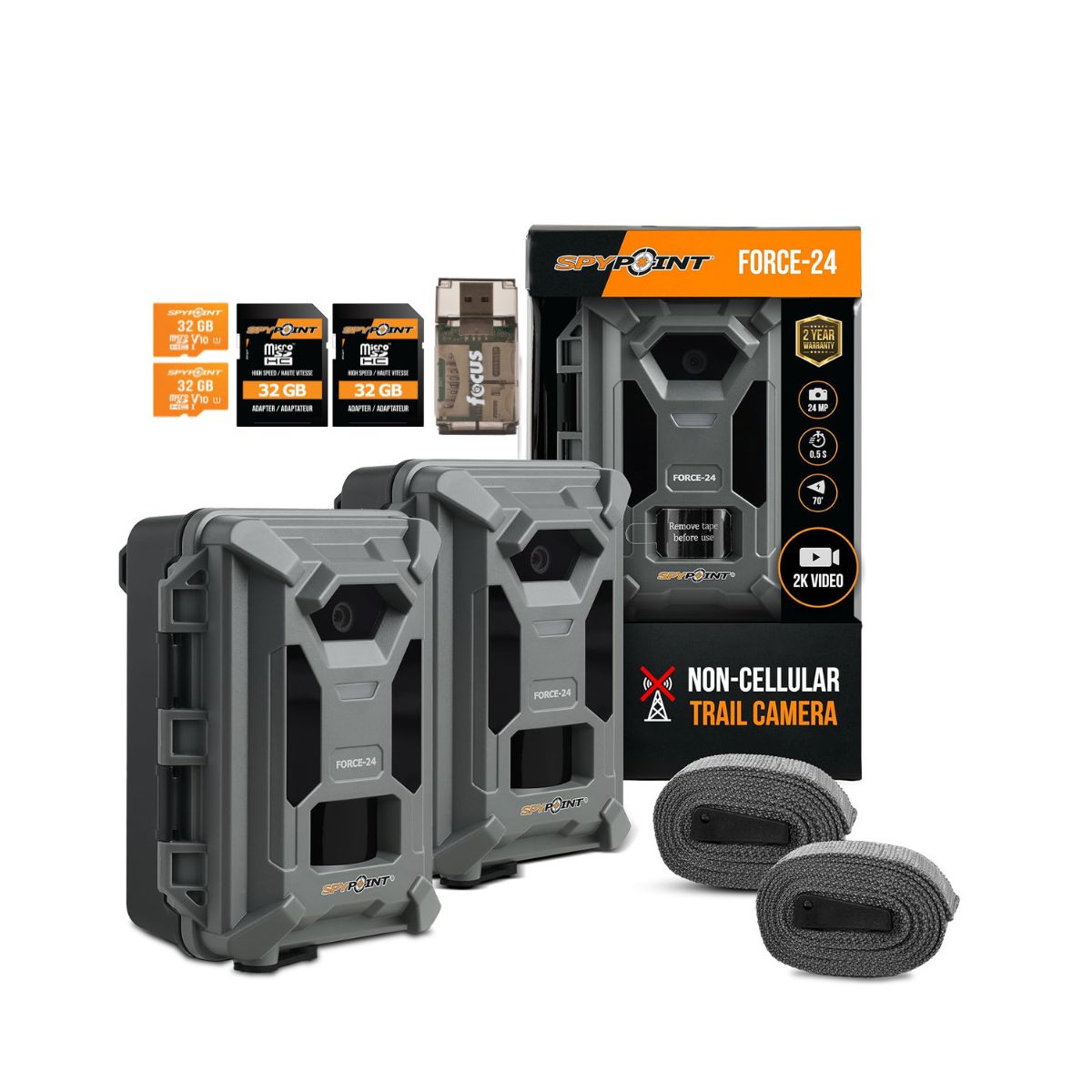 Spypoint Force-24 Trail Camera 24MP 2K Video Sound Recording 0.5s Trigger Speed 70ft Detection (Twin Pack)Reliable Performance, Every TimeThe Spypoint Force-24 Trail Camera delivers high-performance scouting power in a rugged, easy-to-use design. Whether you're monitoring game movement, tracking property activity, or setting up for your next hunting season, this camera offers the reliability and clarity you need. With ultra-sharp 24MP photos and crisp 2K video, you’ll capture every detail.Built to Capture What MattersFeaturing a lightning-fast 0.5-second trigger speed and a detection range of up to 70 feet, the Force-24 is built for real-time responsiveness. Its integrated sound recording and multi-shot modes ensure that you don’t miss a moment. With this twin pack, you get double the coverage, making it easier to monitor multiple locations or angles at once.Features24 Megapixel Image Resolution2K Video Recording with Sound0.5-Second Trigger Speed70-Foot Detection RangeMulti-Shot ModeTime-Lapse ModeSpypoint MicroSD 32GB Ultra High Speed Class 10 Memory CardEnsure proper storage capacity and image retention with the Spypoint 32 GB ultra high speed microSD card. The Spypoint MICRO-SD-32GB Class 10 Memory Card delivers the performance you need to capture the best images possible, and with 32 GB of storage, you won’t have to run to the woods to swap full cards every few weeks.All-In-One High Speed Card ReaderTransfer data to and from your PC with this All-In-One High-Speed USB 2.0 Card Reader by Focus Camera. The high-speed memory card reader provides a transfer rate of 480 Mbps and supports most media cards, including SD, SDHC, micro SD, MMC, TF, M2, and PRO Duo cards. Compatible with both Mac and PC systems, this USB card reader is made with a plastic shell that is exceptionally durab.