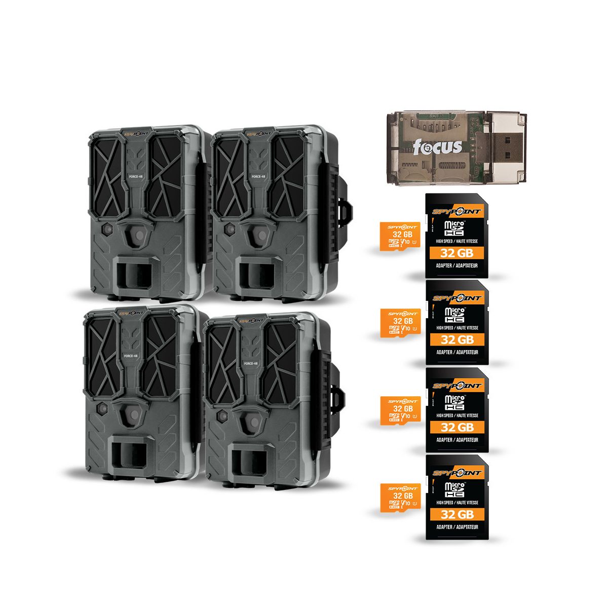 Spypoint Force-48 Trail Camera with 48MP Photo 720p Resolution, and Time-Lapse Multi-Shot ModesTrack game with crystal-clear precision and reliable performance using the SPYPOINT FORCE-48 Trail Camera. Designed for hunters, wildlife watchers, and property owners, the FORCE-48 delivers a massive 48MP image resolution and sharp 720p video to give you a front-row view of every movement in the field. With powerful low-glow infrared LEDs, a blazing-fast trigger speed, and multiple shooting modes—including time-lapse and multi-shot—you’ll never miss a moment, day or night. Whether you're monitoring trails or securing your land, the FORCE-48 is your eyes in the wild.48MP High-Resolution PhotosCaptures stunning, ultra-clear images to help you identify game or monitor property in vivid detail.720p HD Video RecordingRecords high-definition video clips for enhanced observation and documentation of wildlife activity.0.5-Second Trigger SpeedLightning-fast trigger ensures you don’t miss fast-moving subjects.80-Foot Infrared Flash RangeEquipped with 48 low-glow LEDs and infrared boost technology for clear nighttime images without spooking animals.Multi-Shot Mode (Up to 5 Images)Takes multiple images per detection, increasing your chances of catching all the action.Time-Lapse ModeCapture photos at custom intervals, ideal for monitoring specific spots throughout the day.User-Friendly 1.5-inch Configuration ScreenEasily adjust settings and review images in the field with the integrated screen.Comprehensive Image StampingIncludes date, time, temperature, and moon phase on every photo for detailed tracking.Wide Detection Coverage80-foot detection range with a sensor covering 3 zones ensures broad area surveillance.Durable, Compact DesignWeather-resistant housing built for rugged outdoor conditions with standard tripod mount compatibility.Spypoint MicroSD 32GB Ultra High Speed Class 10 Memory CardEnsure proper storage capacity and image retention with the Spypoint 32 GB ultra-high-speed microSD card. The Spypoint MICRO-SD-32GB Class 10 Memory Card delivers the performance you need to capture the best images possible, and with 32 GB of storage, you won’t have to run to the woods to swap full cards every few weeks.All-In-One High Speed Card ReaderTransfer data to and from your PC with this All-In-One High-Speed USB 2.0 Card Reader. The high-speed memory card reader provides a transfer rate of 480 Mbps and supports most media cards, including SD, SDHC, micro SD, MMC, TF, M2, and PRO Duo cards. Compatible with both Mac and PC systems, this USB card reader is made with a plastic shell that is exceptionally durable..
