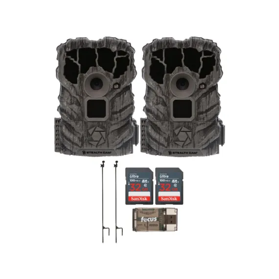 Stealth Cam Browtine 14MP Trail Camera with VideoThe Stealth Cam Browtine 14MP Camera has a 60-foot detection and flash range that see farther with a long-distance PIR sensor and LEDs. With a 0.7-second trigger speed, it never misses a shot with lightning fast 0.7-second trigger speed.Quick Set OptionsYou can set it up in seconds with pre-programmed options. Set camera to desired Quick Set (QSET) or to custom configuration and place in the desired vantage point to start capturing photos of the game.Burst Rapid-Fire ModeThrough rapid-fire burst mode, you will get multiple exposures per triggering.18 IR LEDsPerfectly illuminate your nighttime photos with 18 IR LED lights.Battery and SD CardThe Stealth Cam Browtine 14MP Camera requires 8 AA batteries and a class 10 SD card into the camera.Mount the CameraYou can mount the camera at the desired location using the strap mount, Python Lock cable, Articulating Ball Joint Mount, or other desired mounting mechanism. Position the camera so that it does not face East or West directly as the rising and setting of the sun can cause false-positive triggers.HME Trail Camera Holder PostThe HME Products Trail Camera Holder Post will allow users to place their trail camera anywhere.Strategic PlacementThe HME Products Trail Camera Holder Post allows the user to place a trail camera anywhere. This will enable the user to strategically place their trail camera on the frequently used trails or food plots when there are no trees available or over a scrape at the perfect distance.Accommodates Any Trail CamThis simple, compact, and sturdy design easily steps into the ground providing a dependable means for supporting all trail cameras with a 1/4-inch by 20 thread insert on the bottom. Once the trail camera is installed onto the threaded end of the camera mount, rotate into the desired position and lock with a rubber washer and wing nut. Continue by loosening the 3/8-inch wing nut of the vertical adjustment and pivot the camera into position and re-tighten the wing nut. Would also work great in a ground blind or for any outdoor activity when videotaping.SanDisk 32GB Ultra SDHC UHS-I Memory CardThe SanDisk 32GB Ultra SDHC UHS-I Memory Card allows you to capture better pictures and Full HD videos with your compact to mid-range point and shoot cameras. Store tons of photos and videos, with speeds up to 100MB/s to quickly transfer it all to your computer.Capture the MomentThis SanDisk Ultra SD card delivers exceptional photo and video shooting performance to let you capture your memories when they happen.Picture and VideoCapture amazing quality pictures and Full HD video with your compact point-and-shoot camera.Keep ShootingShoot tons of photos and hours of Full HD video (1080p) without changing the card.DurableThis SanDisk Ultra SD card is durable and tested to protect your memories from life’s mishaps—waterproof, shockproof, x-ray proof, and temperature-proof.Focus All-In-One High-Speed USB 2.0 Card ReaderTransfer data to and from your PC with this All-In-One High-Speed USB 2.0 Card Reader by Focus Camera. The high-speed memory card reader provides a transfer rate of 480 Mbps and supports most media cards, including SD, SDHC, micro SD, MMC, TF, M2, and PRO Duo cards. Compatible with both Mac and PC systems, this USB card reader is made with a plastic shell that is exceptionally durable..