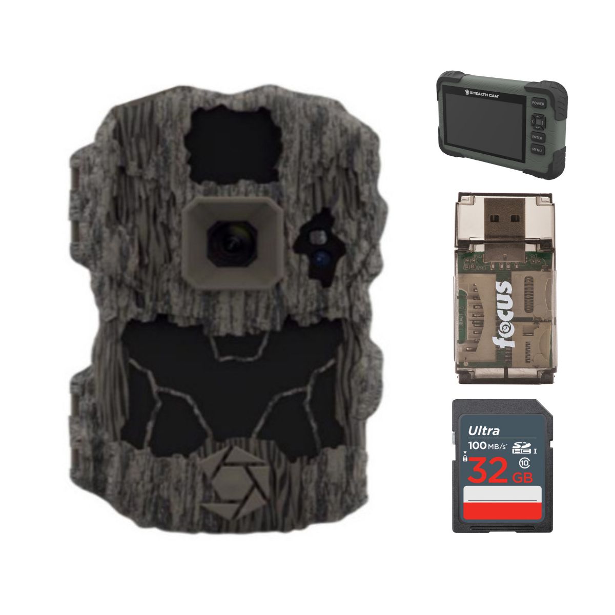 Stealth Cam DS4K Ultimate Camera 32 Megapixel and 4K Video at 30FPS The DS4K Ultimate features a 32-megapixel sensor for the ultimate quality in image size and clarity. A 100-feet NoGlo infrared flash range and an ultra-fast trigger speed of 0.2 seconds ensure you never miss fast moving game. Stealth Cam SD Card Reader/Viewer with 4.3-Inch LCD Touch Screen and Touch Detection Swipe left, right, up, down or zoom in or out. Everything on an SD card is at the tip of your fingers. The new HD 4.3-inch touch screen viewer from Stealth Cam features 5 point touch detection and smart gestures for a user friendly way to view images in the field. SanDisk 32GB Ultra SDHC UHS-I Memory Card The SanDisk 32GB Ultra SDHC UHS-I Memory Card allows you to capture better pictures and Full HD videos with your compact to mid-range point and shoot cameras. Store tons of photos and videos, with speeds up to 100MB/s to quickly transfer it all to your computer. Capture the Moment This SanDisk Ultra SD card delivers exceptional photo and video shooting performance to let you capture your memories when they happen. Picture and Video Capture amazing quality pictures and Full HD video with your compact point-and-shoot camera. Keep Shooting Shoot tons of photos and hours of Full HD video (1080p) without changing the card. Durable This SanDisk Ultra SD card is durable and tested to protect your memories from life's mishaps-waterproof, shockproof, x-ray proof, and temperature-proof. Focus All-In-One High Speed USB 2.0 Card Reader Transfer data to and from your PC with this All-In-One High-Speed USB 2.0 Card Reader by Focus Camera. The high-speed memory card reader provides a transfer rate of 480 Mbps and supports most media cards, including SD, SDHC, micro SD, MMC, TF, M2, and PRO Duo cards. Compatible with both Mac and PC systems, this USB card reader is made with a plastic shell that is exceptionally durable.