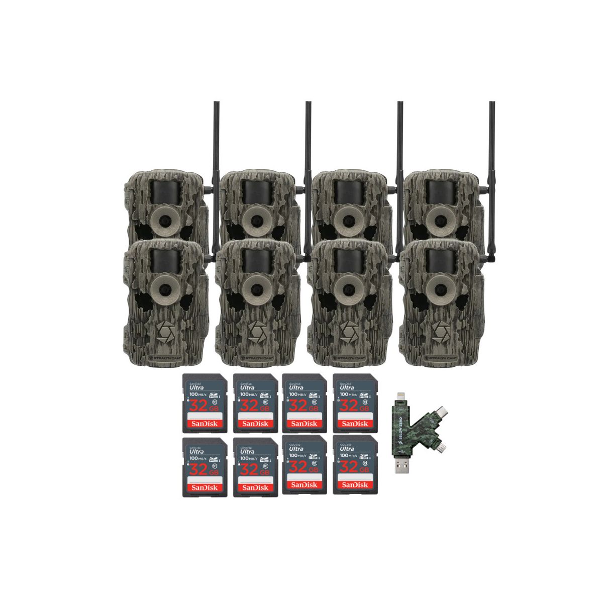 Stealth Cam 36MP Fusion Max Cellular Trail Camera with 80-Feet Detection Range (2-Pack)SanDisk 32GB Ultra SDHC UHS-I Memory Card (100MB/s)The SanDisk 32GB Ultra SDHC UHS-I Memory Card allows you to capture better pictures and Full HD videos with your compact to mid-range point and shoot cameras. Store tons of photos and videos, with speeds up to 100MB/s to quickly transfer it all to your computer.Capture the MomentThis SanDisk Ultra SD card delivers exceptional photo and video shooting performance to let you capture your memories when they happen.Picture and VideoCapture amazing quality pictures and Full HD video with your compact point-and-shoot camera.Keep ShootingShoot tons of photos and hours of Full HD video (1080p) without changing the card.DurableThis SanDisk Ultra SD card is durable and tested to protect your memories from life’s mishaps—waterproof, shockproof, x-ray proof, and temperature-proof.Focus All-In-One High Speed Card ReaderTransfer data to and from your PC with this All-In-One High-Speed USB 2.0 Card Reader by Focus Camera. The high-speed memory card reader provides a transfer rate of 480 Mbps and supports most media cards, including SD, SDHC, micro SD, MMC, TF, M2, and PRO Duo cards. Compatible with both Mac and PC systems, this USB card reader is made with a plastic shell that is exceptionally durable..