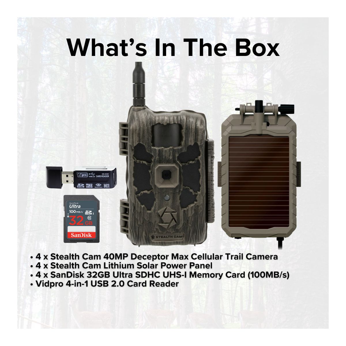 Stealth Cam 40MP Deceptor Max Cellular Trail Camera with 0.4-Second Trigger Speed (2-Pack)Stealth Cam Lithium Solar Power PanelDesigned as a sustainable solution for all trail cameras especially wireless/cellular trail cameras, this 12V Amorphous Solar Power Panel runs on 1000mAh Li-ion battery that works in low light conditions. The notification LED indicates battery level. All-weather construction ensures durability. It features 10-feet insulated metal cable. Also easily mounts to trees and posts with a durable nylon strap and serrated brackets.SanDisk 32GB Ultra SDHC UHS-I Memory Card (100MB/s)The SanDisk 32GB Ultra SDHC UHS-I Memory Card allows you to capture better pictures and Full HD videos with your compact to mid-range point and shoot cameras. Store tons of photos and videos, with speeds up to 100MB/s to quickly transfer it all to your computer.Capture the MomentThis SanDisk Ultra SD card delivers exceptional photo and video shooting performance to let you capture your memories when they happen.Picture and VideoCapture amazing quality pictures and Full HD video with your compact point-and-shoot camera.Keep ShootingShoot tons of photos and hours of Full HD video (1080p) without changing the card.DurableThis SanDisk Ultra SD card is durable and tested to protect your memories from life’s mishaps—waterproof, shockproof, x-ray proof, and temperature-proof.Focus All-In-One High Speed Card ReaderTransfer data to and from your PC with this All-In-One High-Speed USB 2.0 Card Reader by Focus Camera. The high-speed memory card reader provides a transfer rate of 480 Mbps and supports most media cards, including SD, SDHC, micro SD, MMC, TF, M2, and PRO Duo cards. Compatible with both Mac and PC systems, this USB card reader is made with a plastic shell that is exceptionally durable..
