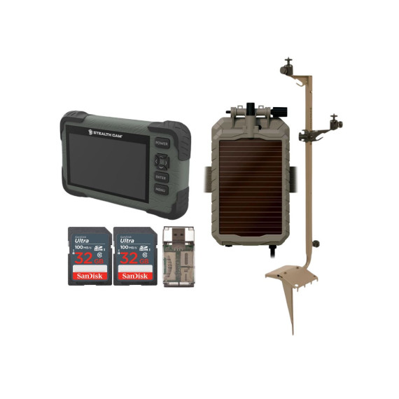 Stealth Cam Revolver 40MP Pro 360-Degree Cellular Trail Camera with 1/4-Inch Threaded MountStealth Cam Sol-Pak 5000mAh Lithium-Ion Solar Battery for 12V DC Jack with LED-IndicatorSanDisk 32GB Ultra SDHC UHS-I Memory Card (100MB/s)The SanDisk 32GB Ultra SDHC UHS-I Memory Card allows you to capture better pictures and Full HD videos with your compact to mid-range point and shoot cameras. Store tons of photos and videos, with speeds up to 100MB/s to quickly transfer it all to your computer.Capture the MomentThis SanDisk Ultra SD card delivers exceptional photo and video shooting performance to let you capture your memories when they happen.Picture and VideoCapture amazing quality pictures and Full HD video with your compact point-and-shoot camera.Keep ShootingShoot tons of photos and hours of Full HD video (1080p) without changing the card.DurableThis SanDisk Ultra SD card is durable and tested to protect your memories from life’s mishaps—waterproof, shockproof, x-ray proof, and temperature-proof.Focus All-In-One High Speed Card ReaderTransfer data to and from your PC with this All-In-One High-Speed USB 2.0 Card Reader by Focus Camera. The high-speed memory card reader provides a transfer rate of 480 Mbps and supports most media cards, including SD, SDHC, micro SD, MMC, TF, M2, and PRO Duo cards. Compatible with both Mac and PC systems, this USB card reader is made with a plastic shell that is exceptionally durable..