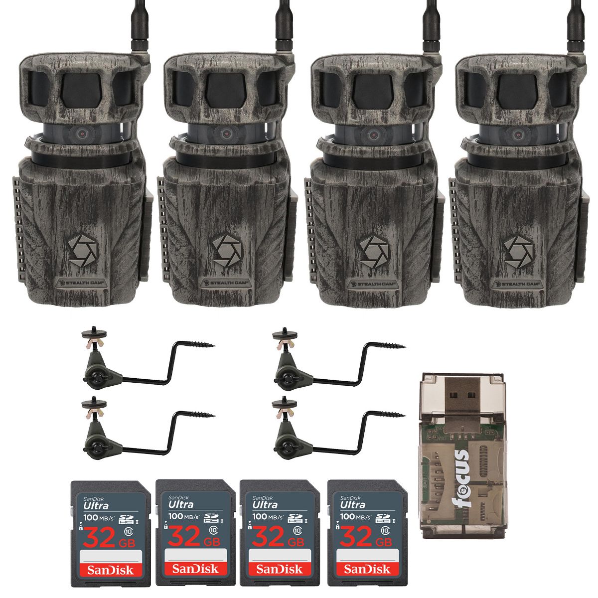 Stealth Cam Revolver 36MP 360-Degree Cellular Trail Camera with 1/4-Inch Threaded MountHME Products Economy Trail Camera HolderThis HME Economy Trail Camera Holder offers a 220-degree of vertical adjustment and a full 360-degree of rotational adjustment. It is designed with a compact and sturdy build in order to support trail cameras with a 1/4-inch x 20mm threaded insert on the bottom. Install the holder on a tree and simply screw the trail camera onto the threaded end of the mount, then rotate to your desired position. You can then screw the camera's locking knob up and against the bottom of the camera to secure that position. Afterwards, continue on by loosening the 3/8-inch wing nut of the vertical adjustment and pivot camera into position before re-tightening the wing nut.SanDisk 32GB Ultra SDHC UHS-I Memory Card (100MB/s)The SanDisk 32GB Ultra SDHC UHS-I Memory Card allows you to capture better pictures and Full HD videos with your compact to mid-range point and shoot cameras. Store tons of photos and videos, with speeds up to 100MB/s to quickly transfer it all to your computer.Capture the MomentThis SanDisk Ultra SD card delivers exceptional photo and video shooting performance to let you capture your memories when they happen.Picture and VideoCapture amazing quality pictures and Full HD video with your compact point-and-shoot camera.Keep ShootingShoot tons of photos and hours of Full HD video (1080p) without changing the card.DurableThis SanDisk Ultra SD card is durable and tested to protect your memories from life’s mishaps—waterproof, shockproof, x-ray proof, and temperature-proof.Focus All-In-One High Speed Card ReaderTransfer data to and from your PC with this All-In-One High-Speed USB 2.0 Card Reader by Focus Camera. The high-speed memory card reader provides a transfer rate of 480 Mbps and supports most media cards, including SD, SDHC, micro SD, MMC, TF, M2, and PRO Duo cards. Compatible with both Mac and PC systems, this USB card reader is made with a plastic shell that is exceptionally durable..