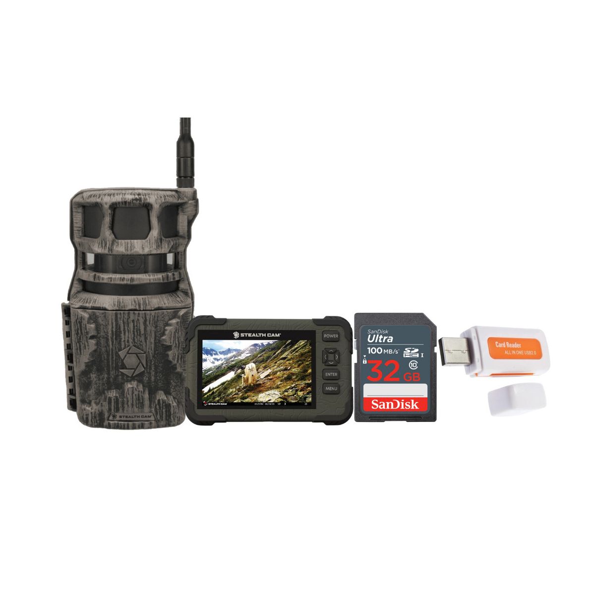 Stealth Cam Revolver 36MP Pro 360 Degree Cellular Trail Camera with Card Viewer 32GB Memory Cards and Card Reader