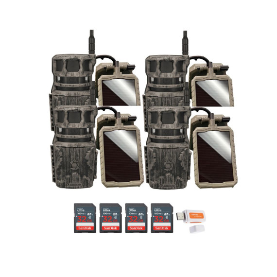 Stealth Cam Revolver 36MP Pro 360 Degree Cellular Trail Camera with Mount Stick 32GB Memory Cards and Card Reader (4 Pack)