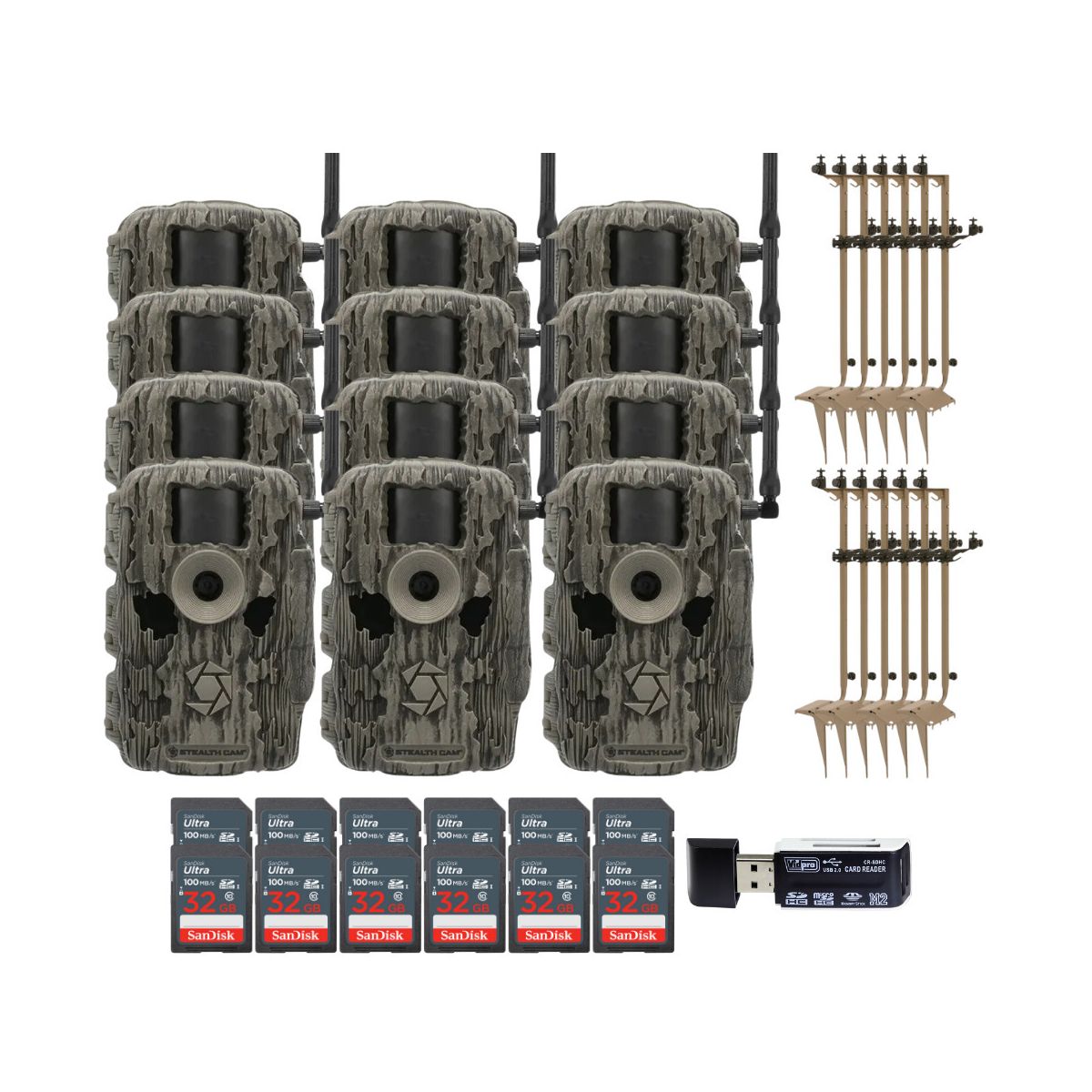 Stealth Cam 36MP Fusion Max Cellular Trail Camera with 80-Feet Detection Range (2-Pack)Stealth Cam Adjustable Multi-Pivot Mounting Post for Trail Camera and Solar Pak BatterySanDisk 32GB Ultra SDHC UHS-I Memory Card (100MB/s)The SanDisk 32GB Ultra SDHC UHS-I Memory Card allows you to capture better pictures and Full HD videos with your compact to mid-range point and shoot cameras. Store tons of photos and videos, with speeds up to 100MB/s to quickly transfer it all to your computer.Capture the MomentThis SanDisk Ultra SD card delivers exceptional photo and video shooting performance to let you capture your memories when they happen.Picture and VideoCapture amazing quality pictures and Full HD video with your compact point-and-shoot camera.Keep ShootingShoot tons of photos and hours of Full HD video (1080p) without changing the card.DurableThis SanDisk Ultra SD card is durable and tested to protect your memories from life’s mishaps—waterproof, shockproof, x-ray proof, and temperature-proof.Focus All-In-One High Speed Card ReaderTransfer data to and from your PC with this All-In-One High-Speed USB 2.0 Card Reader by Focus Camera. The high-speed memory card reader provides a transfer rate of 480 Mbps and supports most media cards, including SD, SDHC, micro SD, MMC, TF, M2, and PRO Duo cards. Compatible with both Mac and PC systems, this USB card reader is made with a plastic shell that is exceptionally durable..