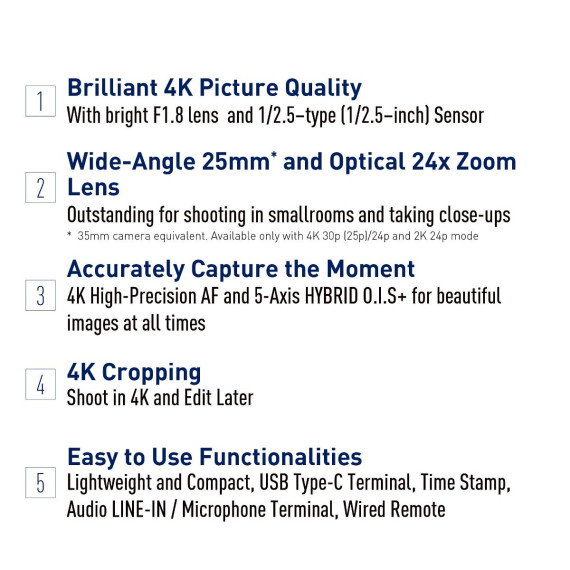 For your most cherished memories in stunning 4K video, the Panasonic VX3 is a 4K camcorder delivers bright, vivid image quality in a portable design that’s easy to take with you. 4K High-Precision AF and 5-Axis HYBRID O.I.S+ ensure images that are focused, not blurry. The touch LCD ensures easy operation. Lightweight and compact, it features an ergonomic grip, plus a USB-C terminal, and remote control port to connect and control easily. Zoom in or out and always have a clear image with 1/2.5-inch sensor and bright F1.8 lens, offering 24x zoom from 25mm wide-angle to 600mm telephoto.