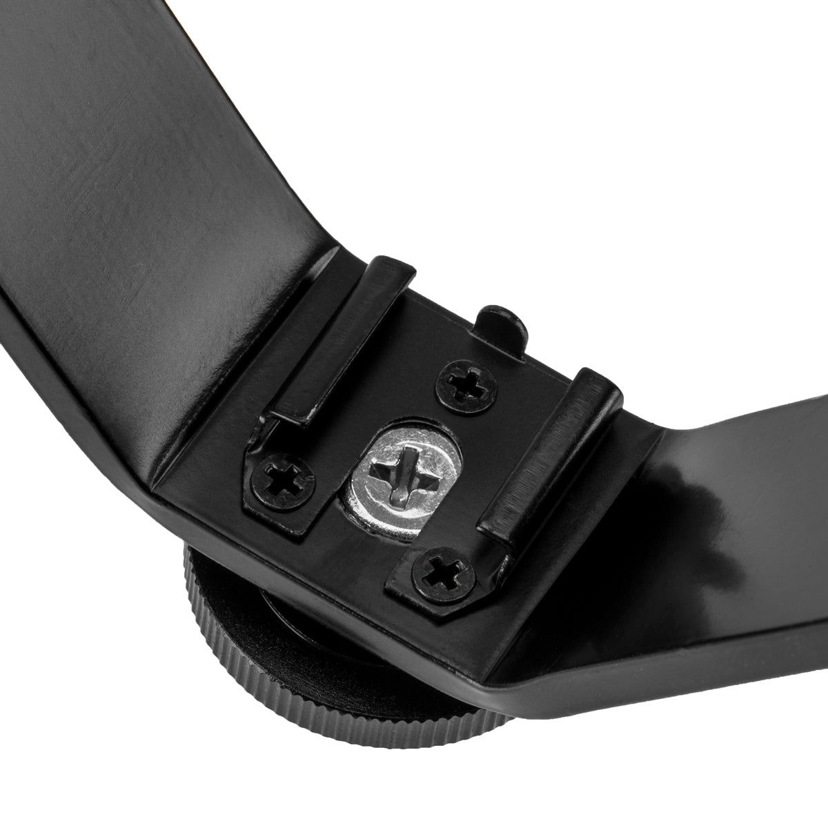 The Triple Shoe V-Bracket connects to a camera using a standard cold shoe, and it can also be mounted to a ¼” screw on a stand, tripod, or other device.