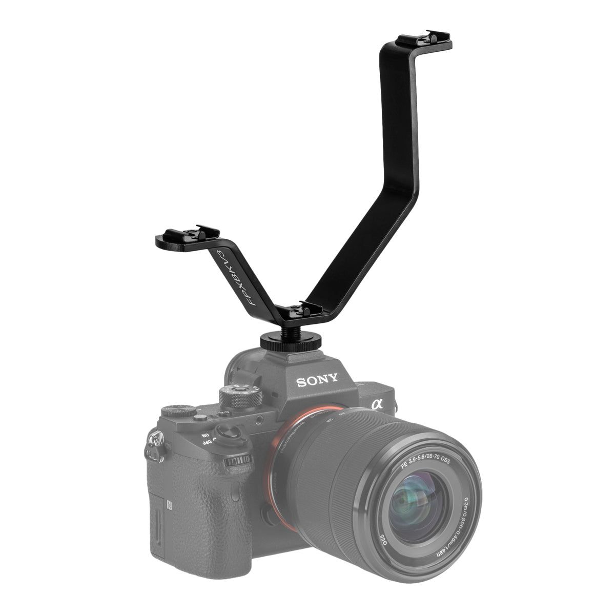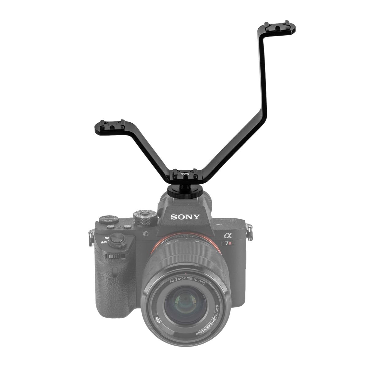 The Flashpoint Triple Shoe V-Bracket allows you to connect 3 shoe mounted devices at different levels on top of one camera’s flash shoe. By staggering the height, you have ample room, without interference, for gear like mics, a lav mic receiver, LED lights, audio recorders, a monitor, viewfinder mount, or any other shoe accessory. The higher, more extended upper shoe arm allows you to place your LED panel farther from the lens, reducing interference with other systems and adding drama and realism to your lighting