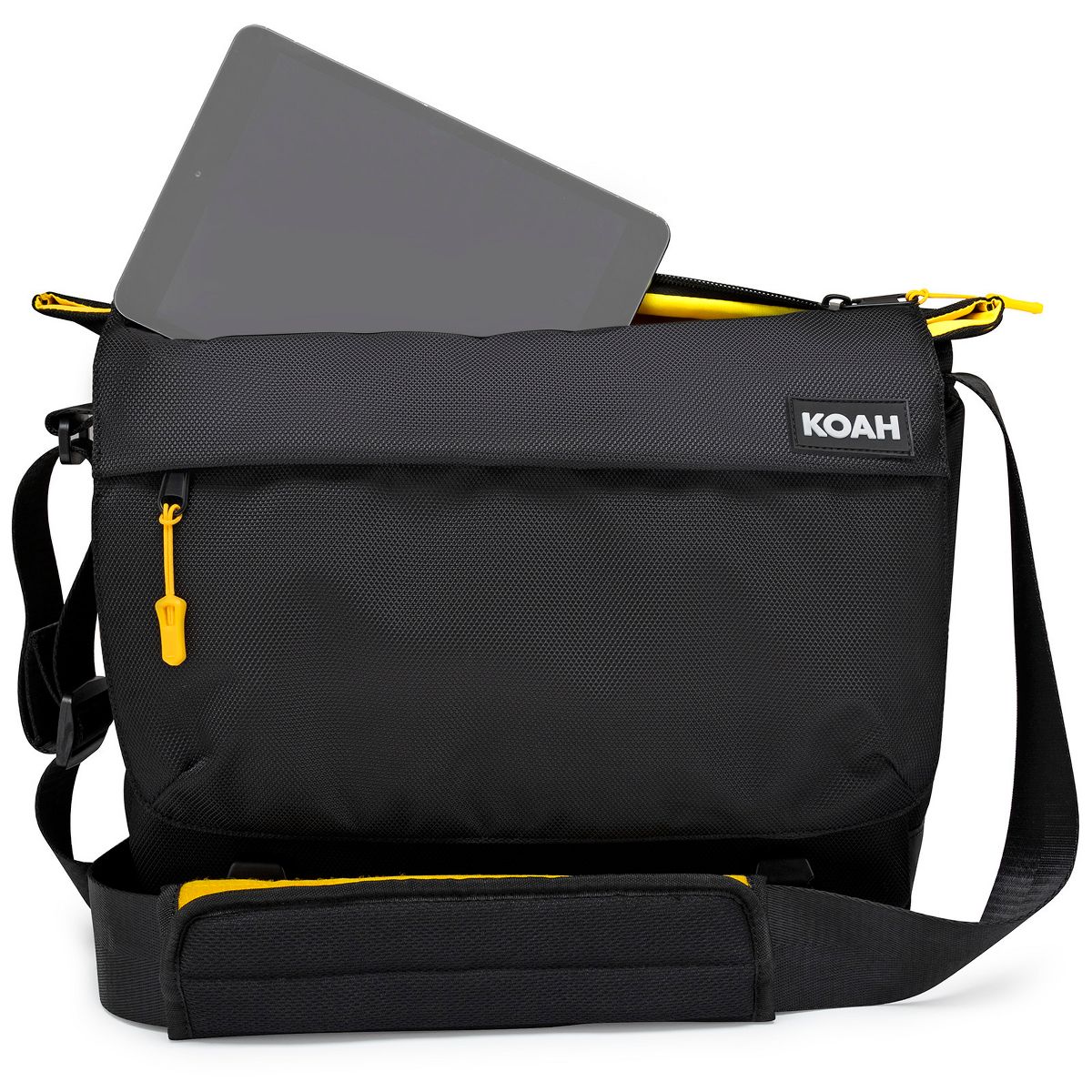 Keep all your photography gear by your side with the Koah Fulton Precision Camera Bag. Designed to meet the needs of the active and serious photographer, the Fulton is a stylish, durable and comfortable shoulder bag. Carries All Your Gear The spacious Koah Fulton Bag fits a DSLR or mirrorless camera and up to three lenses. The Fulton is also designed to carry a tripod externally and is equipped with pockets to carry other accessories. What's more, it features a 12-inch laptop/12.9-inch tablet compartment, padded for security. Designed Smart Durable and comfortable, the Koah Fulton protects against impacts and can be worn for long periods. In addition to its padded protective laptop compartments, the Fulton features a padded insert with touch-fastening dividers to keep your equipment organized. An adjustable padded shoulder strap and a chest/trolley strap provide superior comfort. The bag has a zippered top opening for easy access to your camera, a critical feature for capturing action on the go.