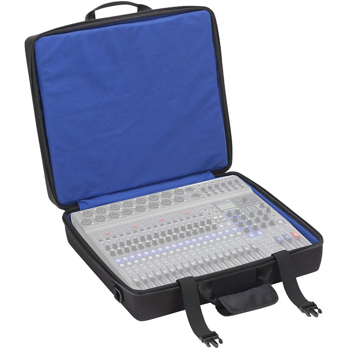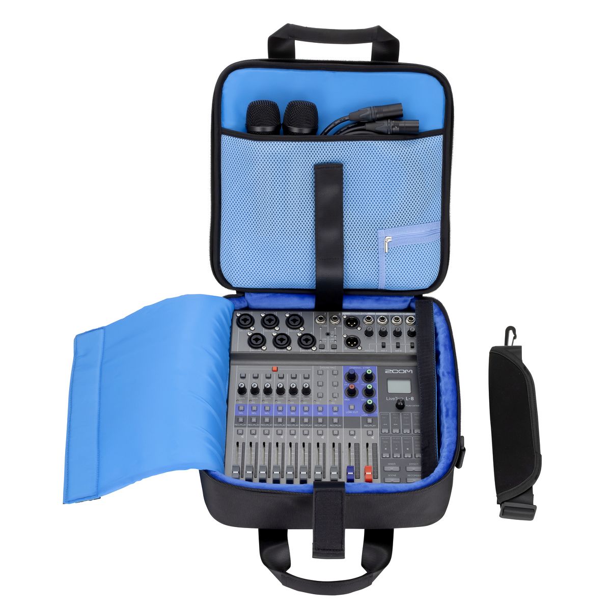 The CBL-8 is semi-hard carrying bag made with EVA (Ethylene-Vinyl Acetate) material. It carries a LiveTrak™ L-8 as well as their accessories such as power adapter, cables and SD cards, and you can take them comfortably. It has stretch-bands to fix the unit securely, pads protect from damage and shock, and a spacer for the L-8 in the bag. And also it comes with a shoulder strap with pads to reduce load of weight.