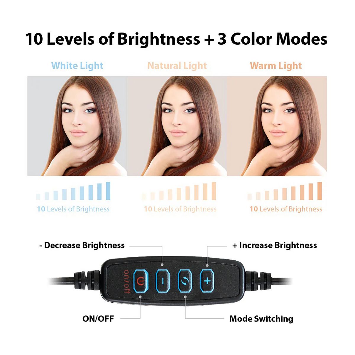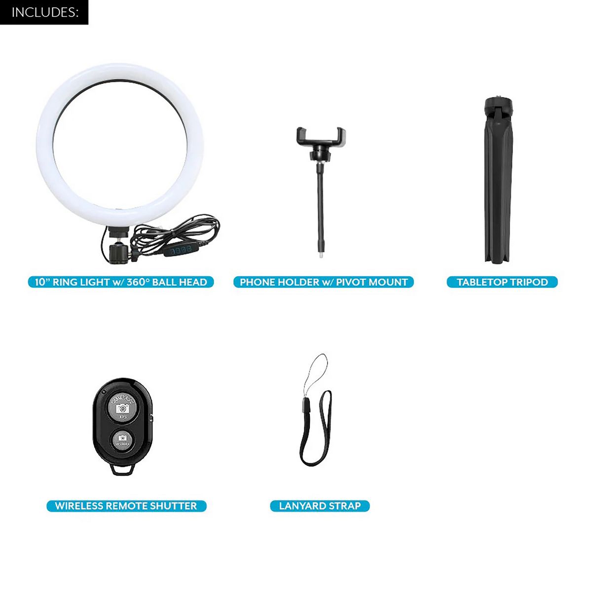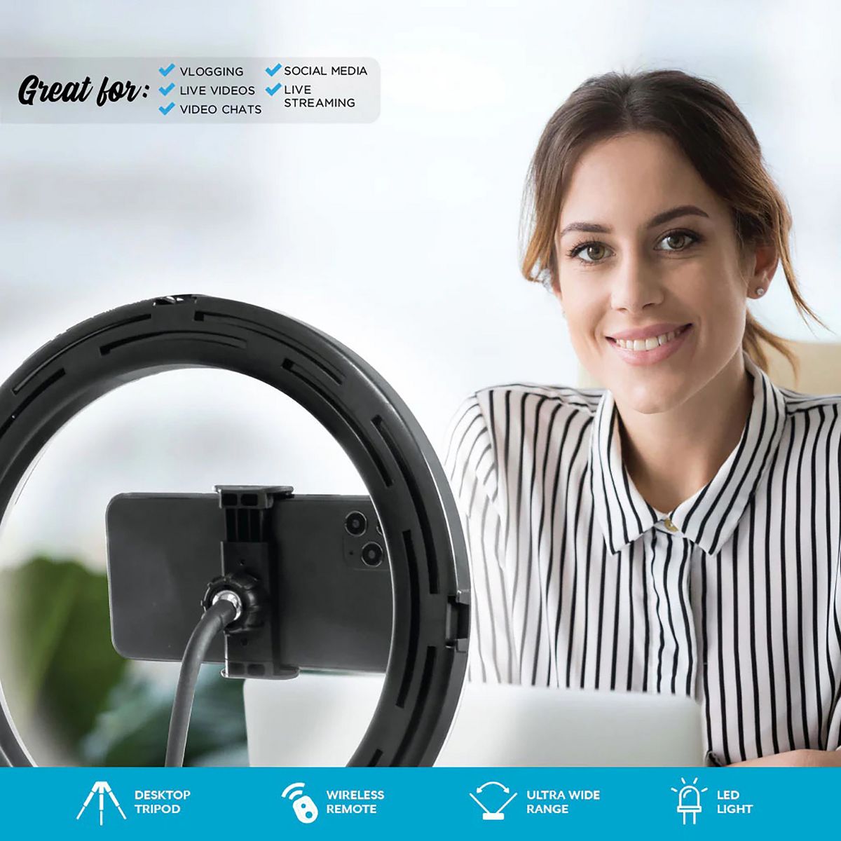 The Bower® 10-In. Tabletop LED Ring Light transforms your smartphone into a professional photo studio. Make videos at night or take great selfies in dark areas. It's great for creating live videos with a smartphones or computer, and ideal for vlogging, live videos, chats, social media, live streaming, health and beauty, and more! It uses LED light for a long-lasting brightness. Choose from 3 light colors and 10 level brightness within each mode. And the ball head design rotates and tilts to your desired angle. Easy control is on the cord to power on/off or switch to the lighting mode you prefer. This ring light makes every photo and video look more professional. Compatible with most smartphones, as long as your phone's width is between 2.3 in. to 3.6 in. Extra padding keeps your phone secure and protected while in use. No battery is needed, since the ring light works with most devices that support a USB port, like desktop, laptop, power bank, USB charger, etc. The included Wireless Remote Shutter allows you to control your phone and snap hand-free photos. The ring light is Android™ and iOS™ compatible.