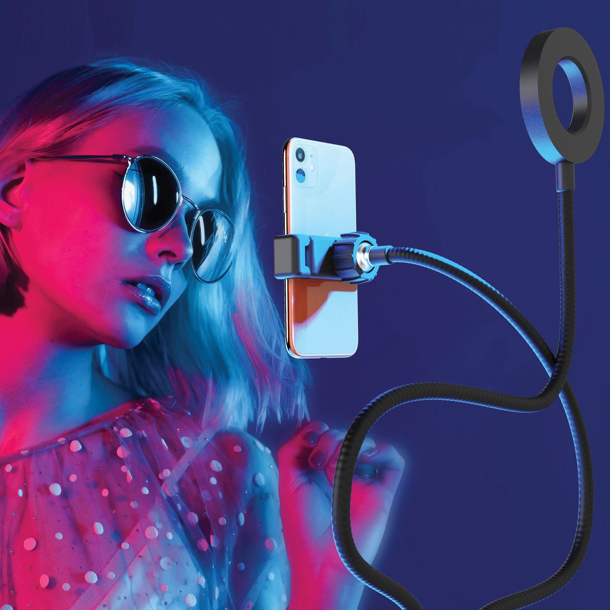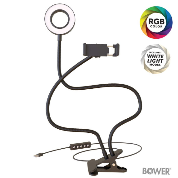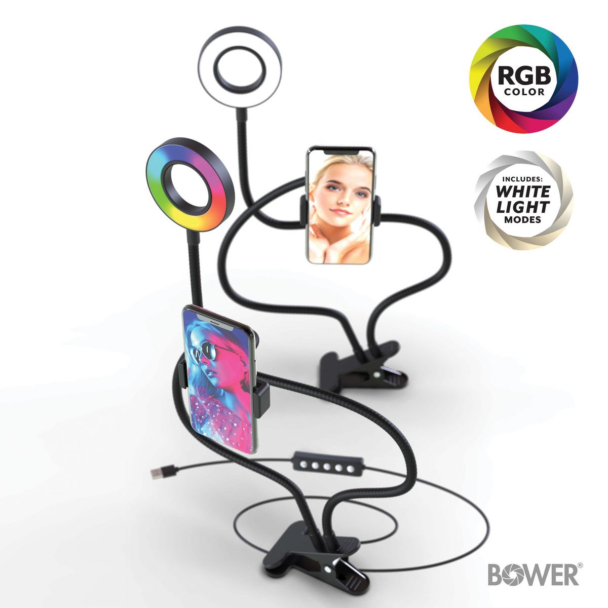 Make videos at night or take great selfies in dark areas with this Bower 24 In. Flexible White and RGB Ring Light. It's ideal for creating live videos with a smartphone or the computer, and for vlogging, video chats, social media, live streaming, and more! The 24 in. flexible arm is designed to fit most phones and can be positioned into any shape. The 360° rotating lazy bracket clip can adjust to any angle and opens up to 3.6 in. to fit most phones.