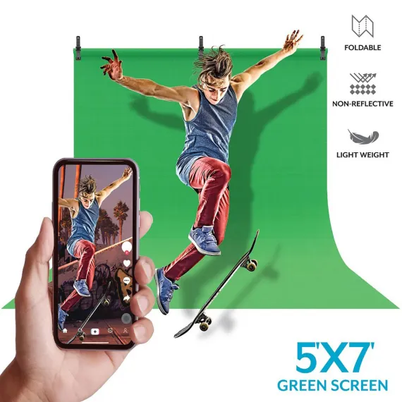 Be in the spotlight. The Bower® Green Screen Backdrop is designed to cut down on your editing time. It is suitable for chroma-keying with post-production video editing software such as Adobe Premiere®, Adobe® After Effects®, and Adobe Photoshop®. The lightweight polyester 5 ft. x 7 ft. green screen eliminates reflection, absorbs excessive light, and enables clean chroma-key composting. Take photos and videos with your smartphone camera and add your desired background in post-production editing.