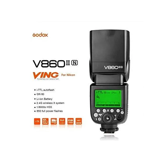 Make sure this fits by entering your model number. Godox wireless X system, build-in 2.4G wireless transmission offers all-in-one functions and 100 meters further transmission distance Fully support TTL functions, support for TTL auto flash, manual flash, 1/8000 high-speed sync, flash exposure compensation, flash exposure lock, second curtain sync, modeling flash, etc Godox VING TTL Li-on camera flash V860II guarantees better light shooting experience with build-in Godox 2.4G wireless X system, GN60 high guide number, and 20-200 zoom flash coverage As master flash to trigger Nikon speedlites and as slave flash to receive signals of Nikon speedlites Max. 1.5s recycle time & 650 full power pops, 2000mAh lithium batteries ensure better shooting performance