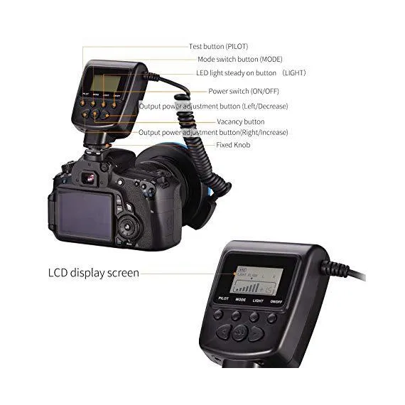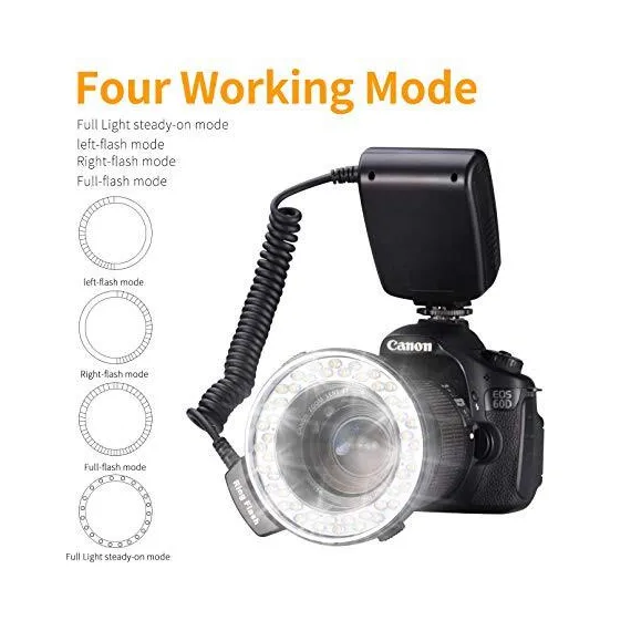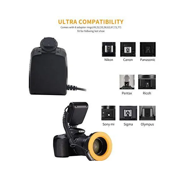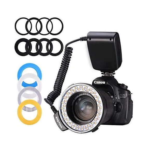 Make sure this fits by entering your model number. This flash light is specially designed to use in the field of macro-shot, scientific research, medical and personal photography in a very close distance shooting. Our ring flash Consists of 48 pieces LED, higher luminance and lower static power consumption. The ring flash fits for any model of Nikon or Canon DSLR. It can provide continuous and stable semi light or full light to meet higher photograph needs. There are 8 Mounting rings adapter suit for 49, 52, 55, 58, 62, 67, 72, 77mm lenses.