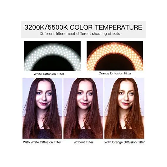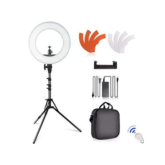 Make sure this fits by entering your model number. Excellent 180 SMD LED Halo Light: Consisted by 180 SMD LED beads with a total of 45W power output. The light could perfectly fill the light and provide continuous natural light. It is perfect for makeup and beauty Salon. 2M Adjustable Light Stand: The adjustable range of the light stand is 33 "-78" /0.8m-2m. It is made of aluminum alloy with excellent strength. It is very stable. And the youtube light can rotate 180° freely to adjust the lighting angle. Stepless Dimmable Ring Light: The dimmable range is from 10%-100% and the color temperature is 3200K/5500K(±200K). It could provide a variety of options. You could choose the most suitable one for your photography. Strong Compatibility: A hot shoe adapter is compatible with smart phones: iPhone 6 plus/6/5/5S, Samsung Galaxy S6 Edge/S6/S5, etc. Equipped with a bluetooth self-timer, it is very convenient to take photos with remote control. What You Get: 1xLED Ring Light, 1xLight Stand, 2xDiffuser (White&orange), 1xSmart Phone Holder, 1x Selfie Remote Control for Smartphones, 1xHot Shoe Adapter, 1x Plug, 1x Power Adapter, 1x Portable Black Bag. It is backed with 12-month warranty and life-time e-mail Customer Support.
