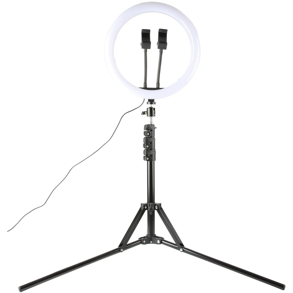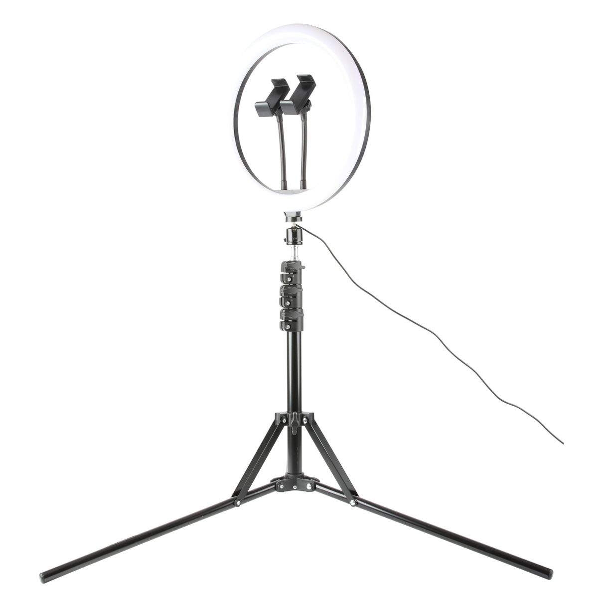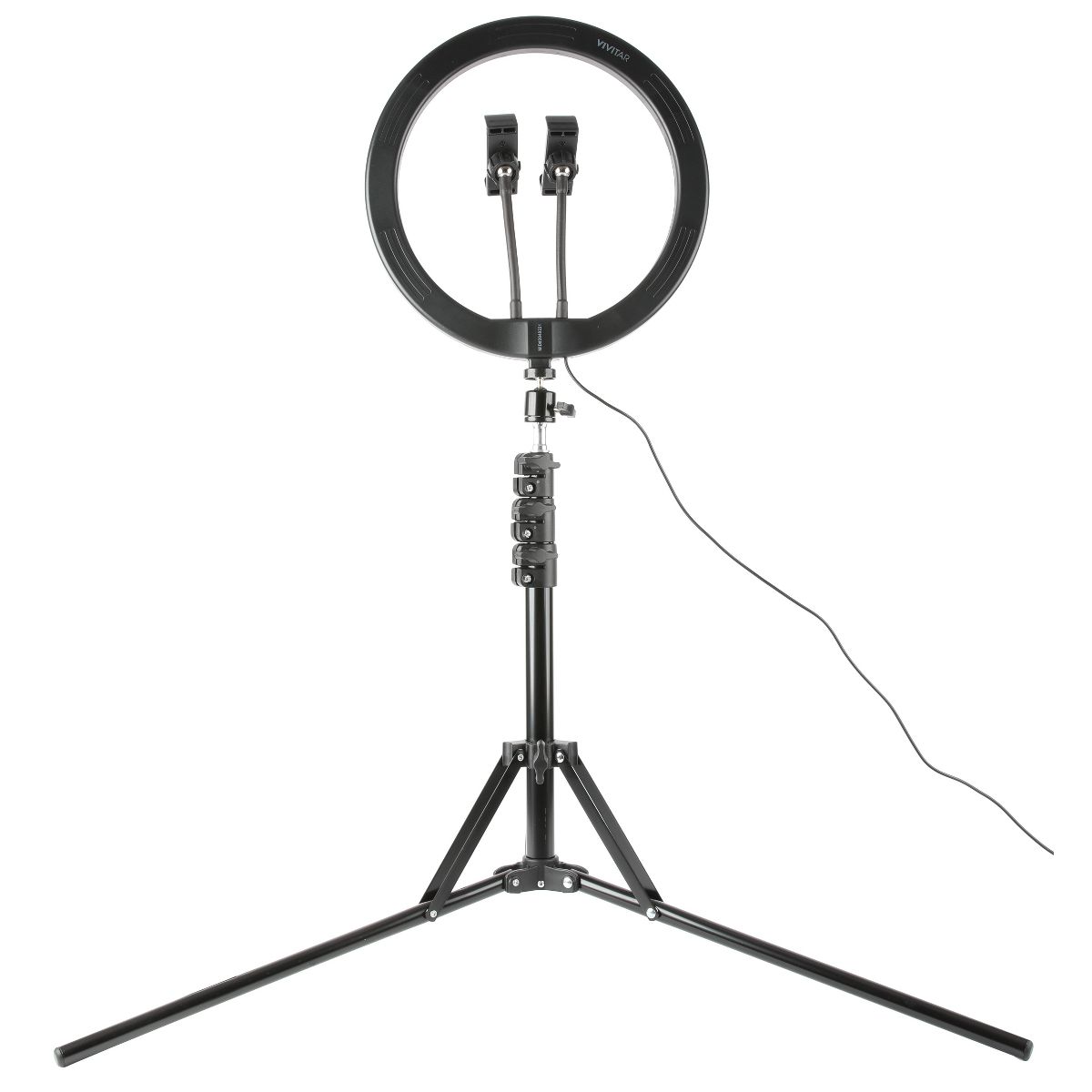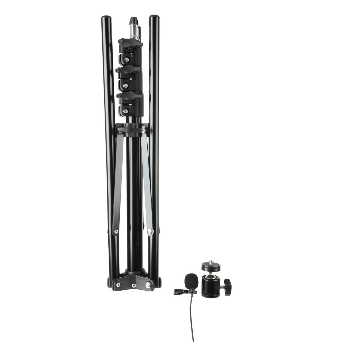 Capable of taking two photos or videos at the same time, the Vivitar 12" Professional Ring Light Kit with Mini Lavalier Microphone is ideal for livestreaming, vlogging, or virtually any online activity. The 12" ring light has LEDs to blend into any scene or indulge in chromatic creativity. The kit has two smartphone holders on flexible goose necks so you can find the perfect angle. The lavalier mic provides good quality sound and includes a usb adapter for computer use. The 63" light stand conveniently folds to just 16" and is topped with a ball head for fine adjustments.