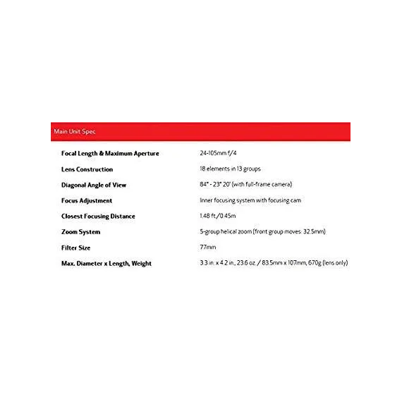 Make sure this fits by entering your model number. 24-105mm standard zoom lens with f/4 maximum aperture for Canon EOS SLR cameras, Macro Focus Range : 0.45 m 1 Super UD glass element and 3 aspherical lenses minimize chromatic aberration and distortion Ring-type USM system delivers silent but quick autofocus (AF); full-time manual focus Image Stabilizer technology steadies camera shake at up to 3 stops; weighs 23.6 ounces Dust- and moisture-resistant; measures 3.3 inches in diameter and 4.2 inches long; 1-year warranty