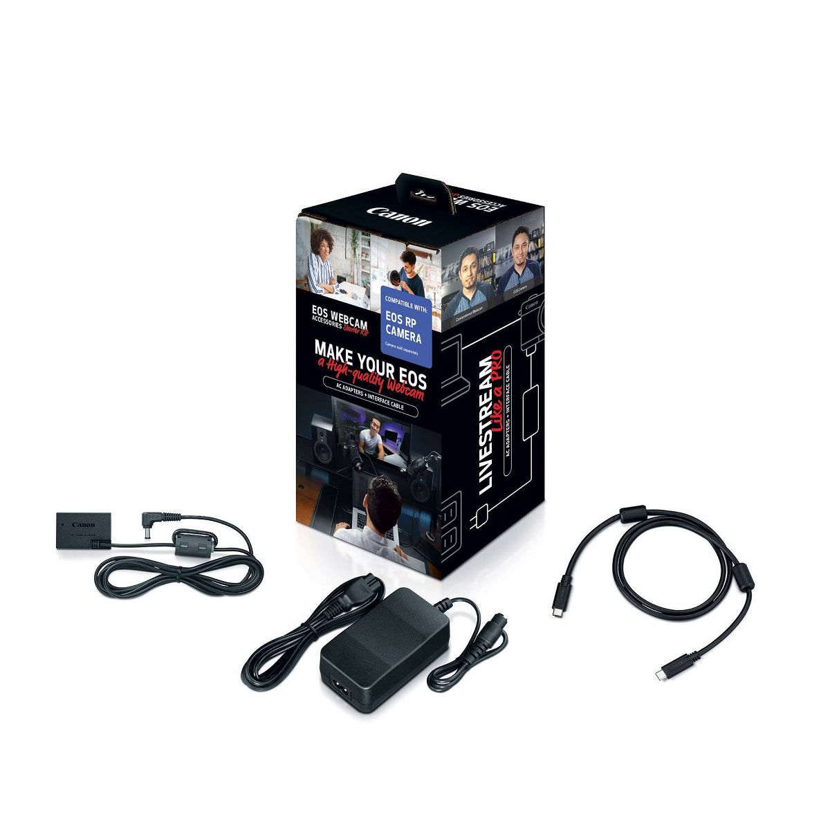 Turn your EOS RP camera into a high-performance webcam that can help enhance the quality of your content, the way you share it, and for how long with our EOS Webcam Accessories Starter Kit for the EOS RP*. Once you’re set with the free EOS Webcam Utility software, simply connect the camera to a compatible laptop/desktop/PC with the provided Interface Cable IFC-100U, power it with the included AC Adapter AC-E6N paired with the supplied DC Coupler DR-E18 using a standard home outlet, and you’re on your way to superb clarity and longer continuous shooting. Your audience will be able to see you clearly and easily whether you’re working, teaching, livestreaming or just reaching out to friends and family. Get the accessories you need, in one convenient package, and put yourself out there with the quality and ease you desire.