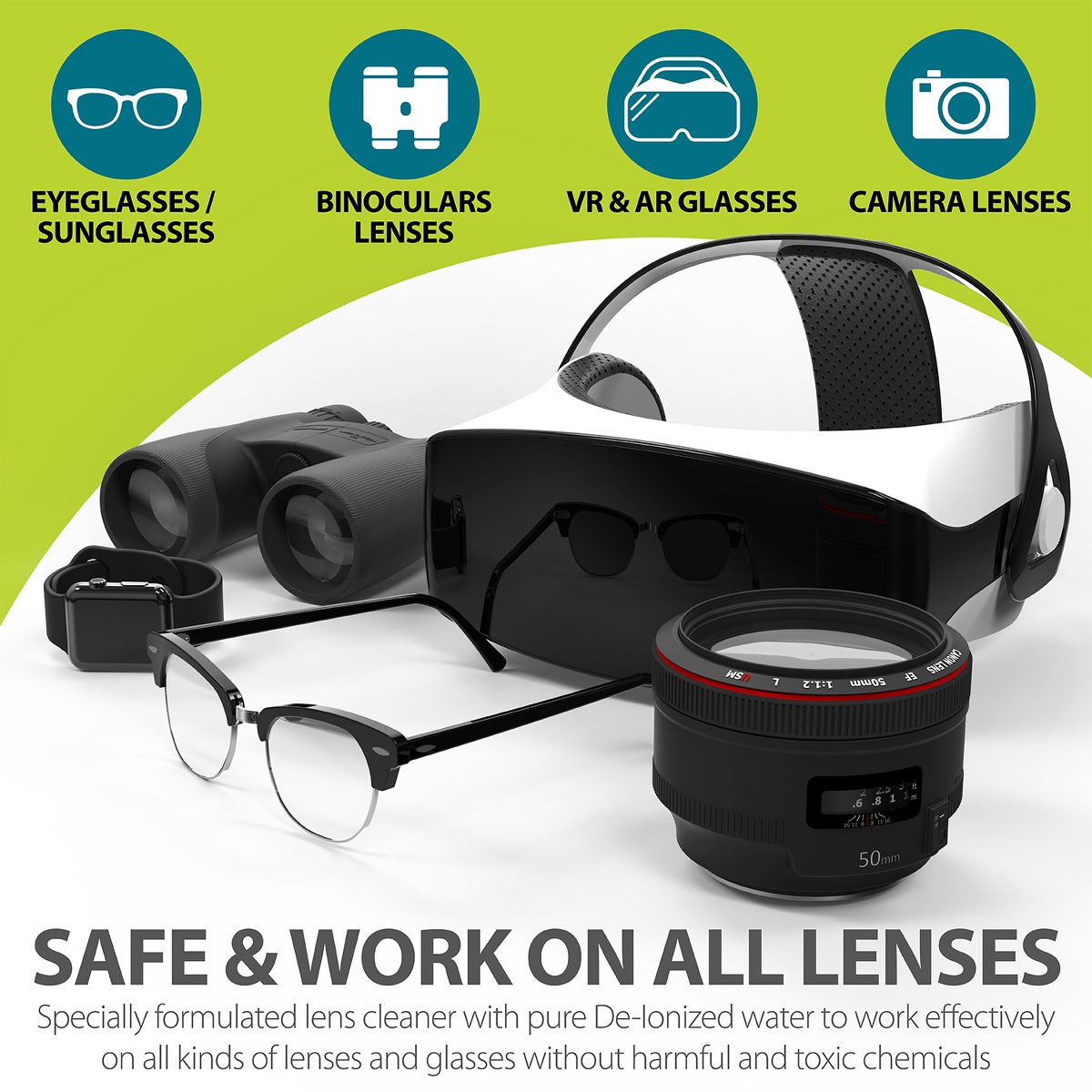 Our lens cleaning kit works effectively on all kinds of lenses and glasses without leaving behind any unwanted streaks or smudges. Our cleaning solution is designed to provide an incomparable lens cleaning experience that is safe for camera lenses, telescope lenses, binoculars, eyeglasses, sunglasses, VR and AR electronic glasses.